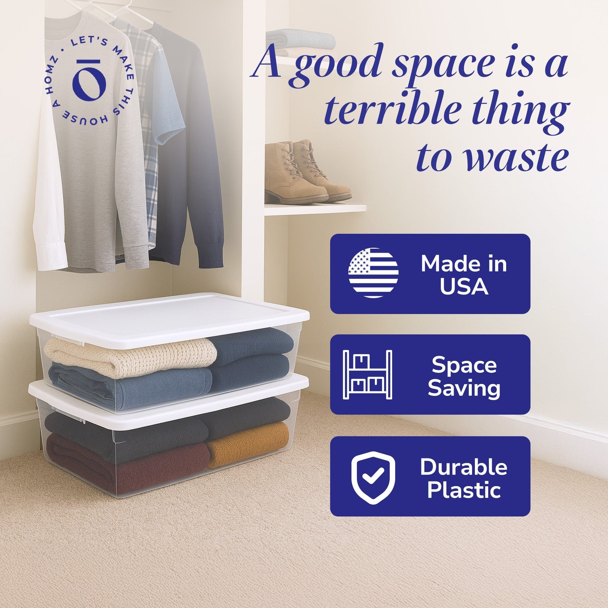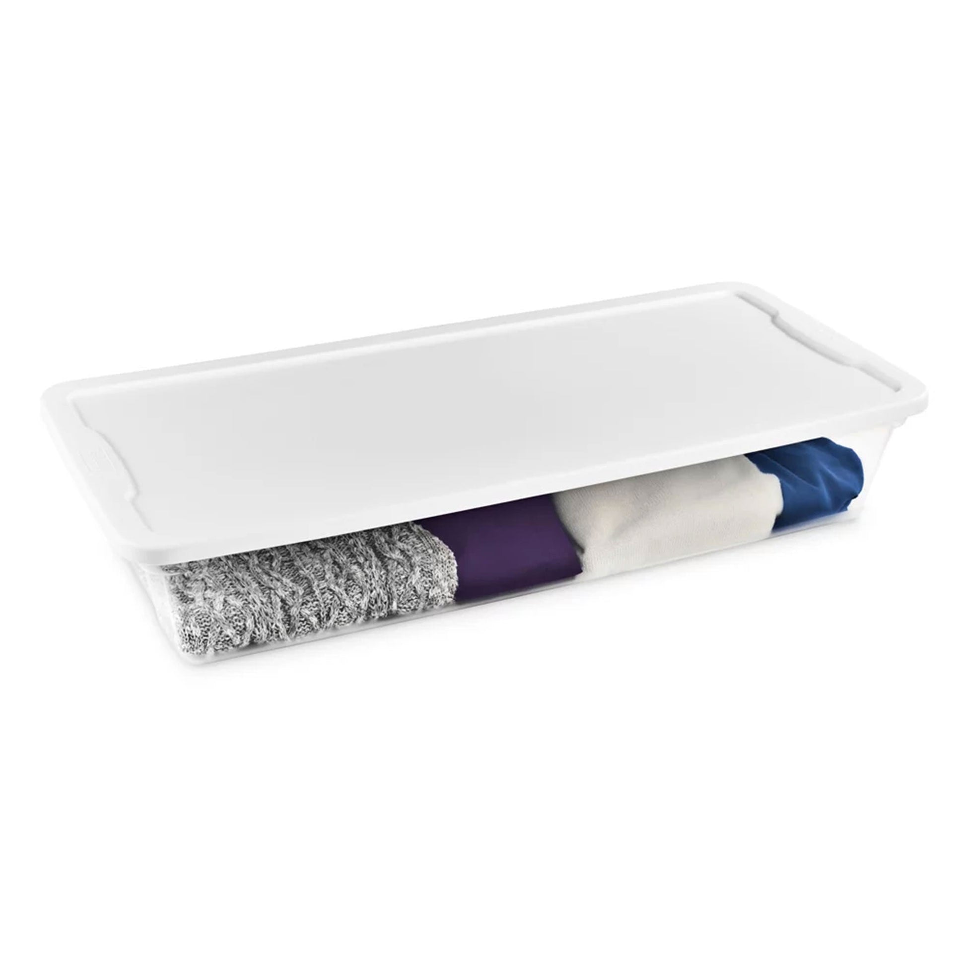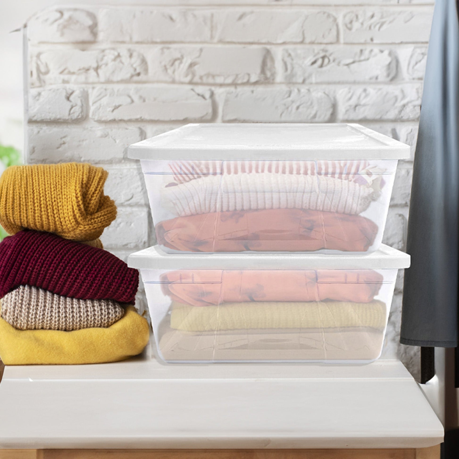 Profoundly indented lids and a modular design enable secure stacking, optimizing vertical storage capacity in your kitchen, bathroom, and closet. Bins fit snugly when stored away, promoting efficient organization. Ideal for bathroom, kitchen, garage, dorm, and off-season storage, these storage containers are designed for extended and enduring utility. Each bin is constructed of robust, high-strength plastic with dimensions of 15.5 inches long, 34.38 inches wide, and 6 inches tall. With the 6-inch height, the clear organizer box is great for under-bed storage, too!