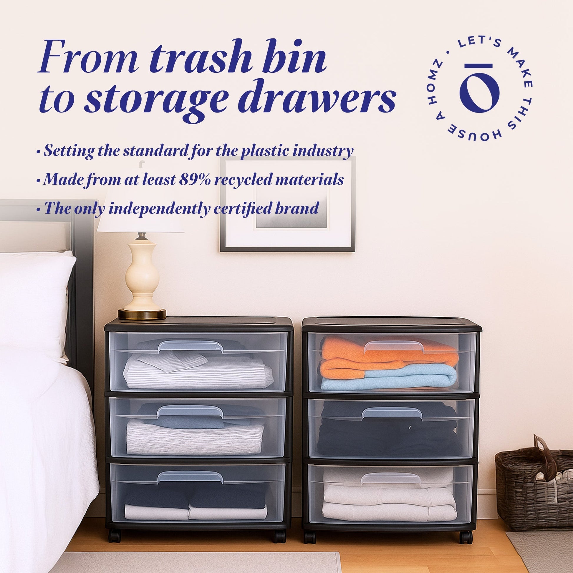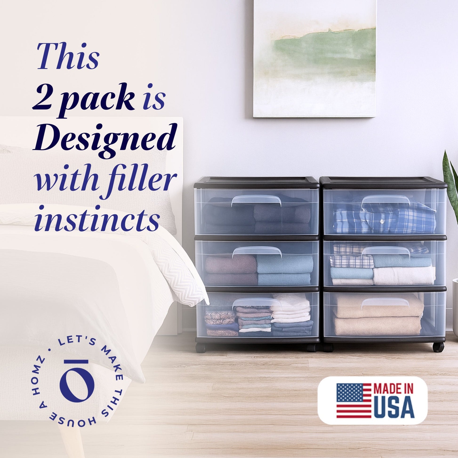 Homz Tall Solid Plastic 3 Drawer Medium Storage Cart with Wheels, Black (2 Pack)