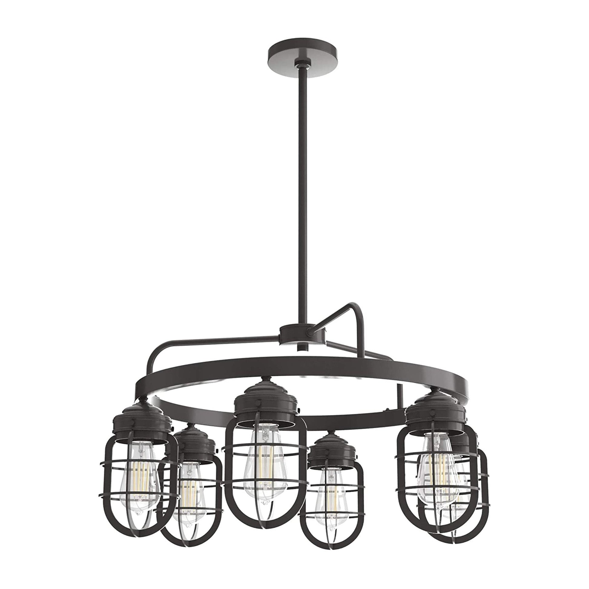 The farmhouse-style chandelier produces a lovely spread of light in your kitchen, living room, or entryway without the need for other fixtures. Featuring a rustic noble bronze finish, the timeless fixture complements almost any style of home decor. A unique, caged-light design resembles old-fashioned mine lanterns, creating a historic, timeless feel perfect for farmhouse or modern-industrial looks. Working with (6) 60-watt Edison LED bulbs, the chandelier provides excellent illumination in your home.