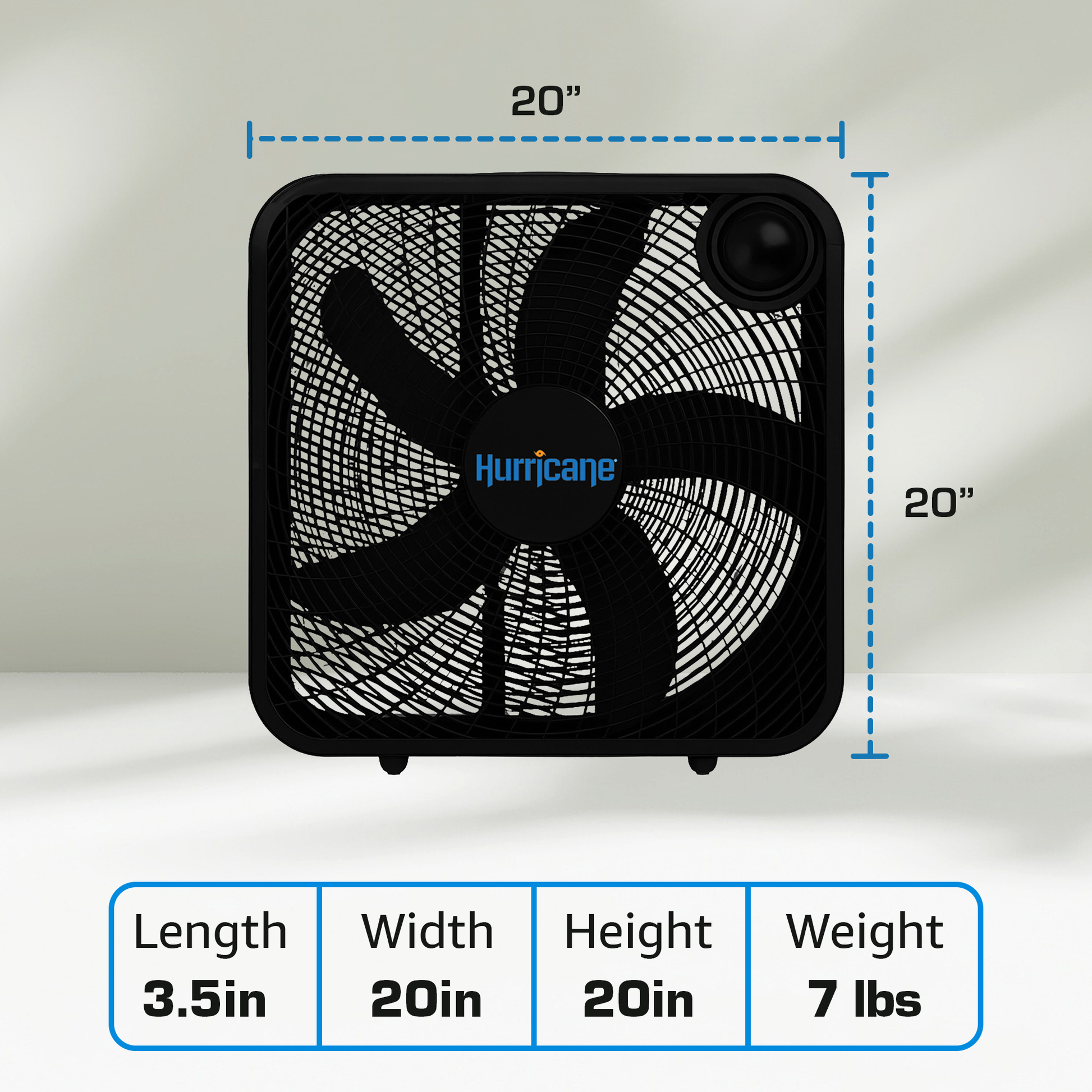 Designed for versatility and efficiency, this fan is a must-have for any space, from homes to greenhouses, garages to workshops. Featuring a highly portable design, this fan for your bedroom allows you to enjoy a refreshing breeze wherever you go. Equipped with 3 efficient speed settings, you can easily customize the airflow from this portable fan to suit your needs. Whether you prefer a gentle breeze or a powerful gust, this box fan delivers with its quiet yet powerful motor. Running at 2400 CFM and 1100 RPM on high ensures maximum airflow output while keeping noise to a minimum. Convenience is essential with the Hurricane Classic. Featuring a slim frame, adjustable feet, and power cord tucking compartment, this cooling fan makes storage a breeze. Whether you need to tuck this floor fan away in a corner or transport it from room to room, this fan makes it effortless. Thanks to its space-saving design, you can place this room fan virtually anywhere. Whether in a window, on furniture, or directly on the floor, its compact size ensures it fits seamlessly into any environment. Measuring just 20 inches by 20 inches with a depth of 3.5 inches, it takes up minimal space while delivering maximum performance.