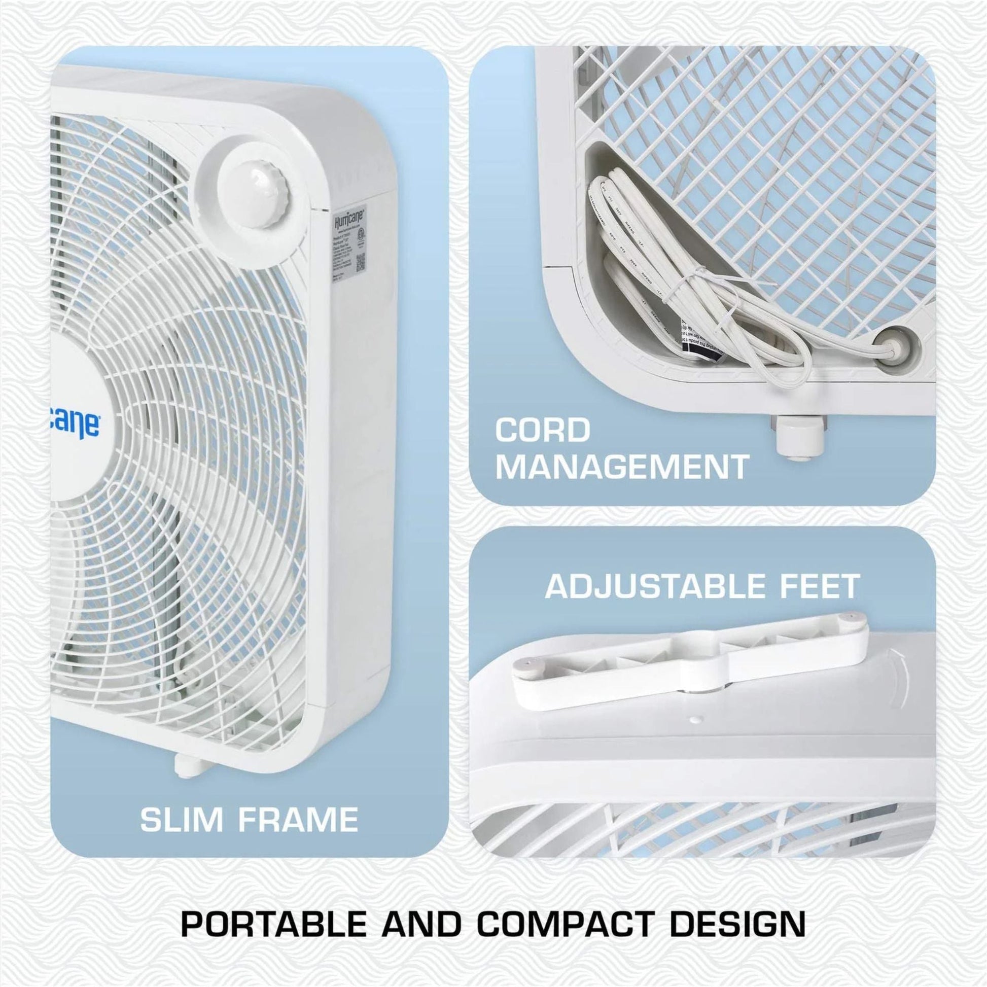 Designed for versatility and efficiency, this fan is a must-have for any space, from homes to greenhouses, garages to workshops. Featuring a highly portable design, this fan for your bedroom allows you to enjoy a refreshing breeze wherever you go. Equipped with 3 efficient speed settings, you can easily customize the airflow from this portable fan to suit your needs. Whether you prefer a gentle breeze or a powerful gust, this box fan delivers with its quiet yet powerful motor. Running at 2400 CFM and 1100 RPM on high ensures maximum airflow output while keeping noise to a minimum. Convenience is essential with the Hurricane Classic. Featuring a slim frame, adjustable feet, and power cord tucking compartment, this cooling fan makes storage a breeze. Whether you need to tuck this floor fan away in a corner or transport it from room to room, this fan makes it effortless. Thanks to its space-saving design, you can place this room fan virtually anywhere. Whether in a window, on furniture, or directly on the floor, its compact size ensures it fits seamlessly into any environment. Measuring just 20 inches by 20 inches with a depth of 3.5 inches, it takes up minimal space while delivering maximum performance.