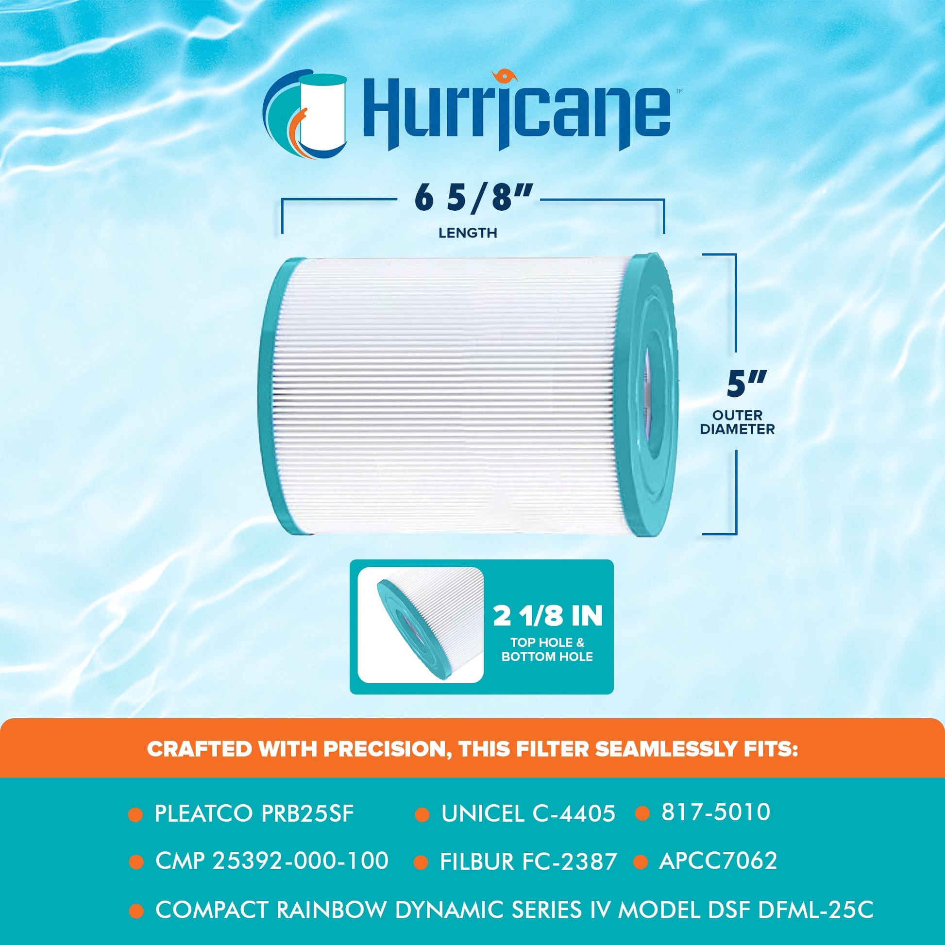 Dive into pristine waters with the Hurricane HF4405-02 Advanced Cartridge Filter, where unparalleled cleanliness awaits. Crafted with meticulous precision, these filters guarantee seamless compatibility with PRB25SF, Unicel C-4405, Filbur FC-2387, APCC7062, CMP 25392-000-100, R17-2464, 817-5010, Compact Rainbow Dynamic Series IV Model DSF DFML-25C and other compatible models. With dimensions measuring 6.63 inches in length, an outer diameter of 5 inches, a top hole of 2.13 inches, bottom hole of 2.13 inches, achieving an ideal fit is effortless, measure your current filter for a flawless match.