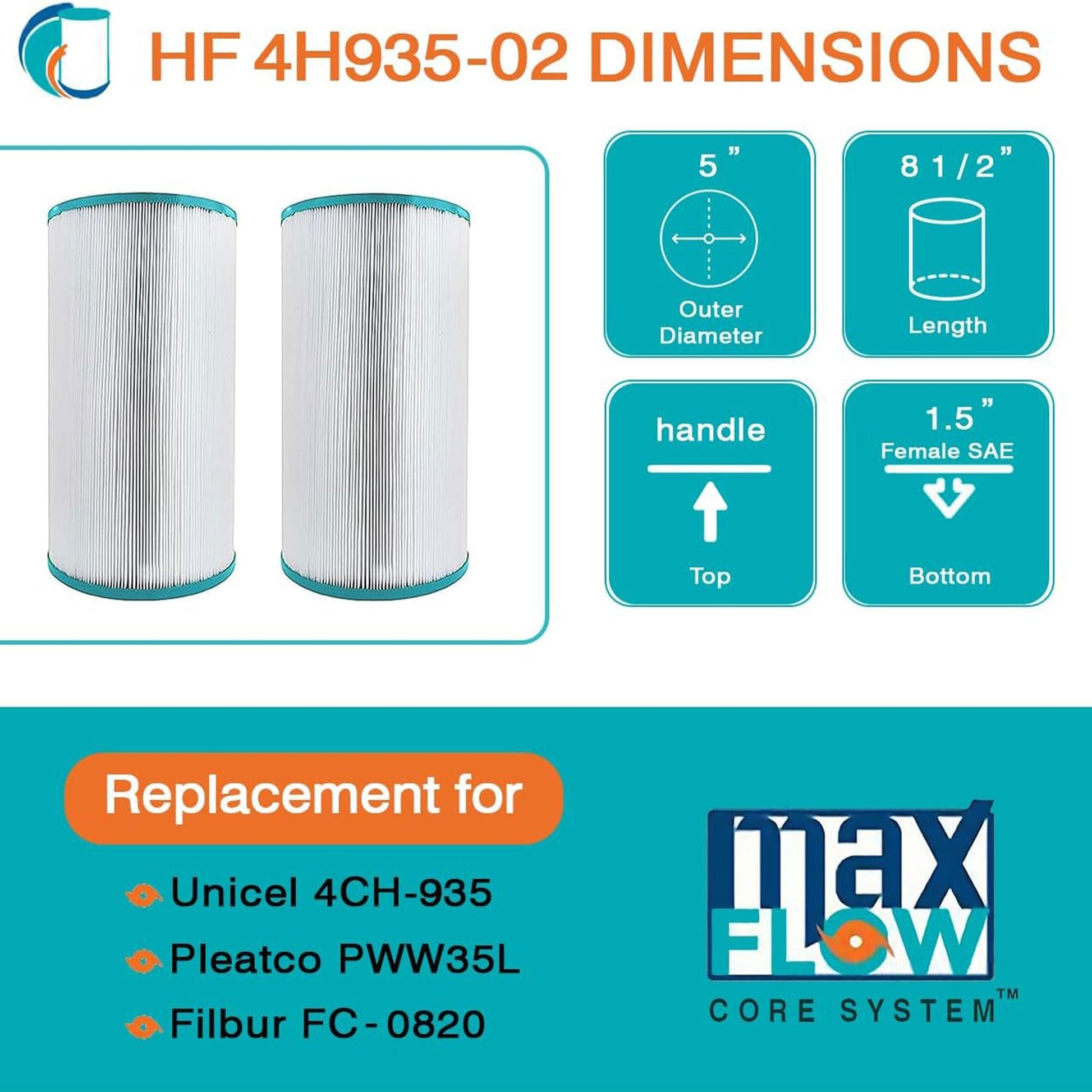 Dive into pristine waters with the 2-pack of Hurricane HF4H935-01 Advanced Cartridge Filter, where unparalleled cleanliness awaits. Crafted with meticulous precision, this filter guarantees seamless compatibility with Unicel: 4CH-935, PWW35L, Filbur: FC-0820, Waterway Teleweir 35 SF and other compatible models. With dimensions measuring 8.5 inches in length, an outer diameter of 5 inches, a top handle, and a bottom hole of 1.5 inches, achieving an ideal fit is effortless, measure your current filter for a flawless match.