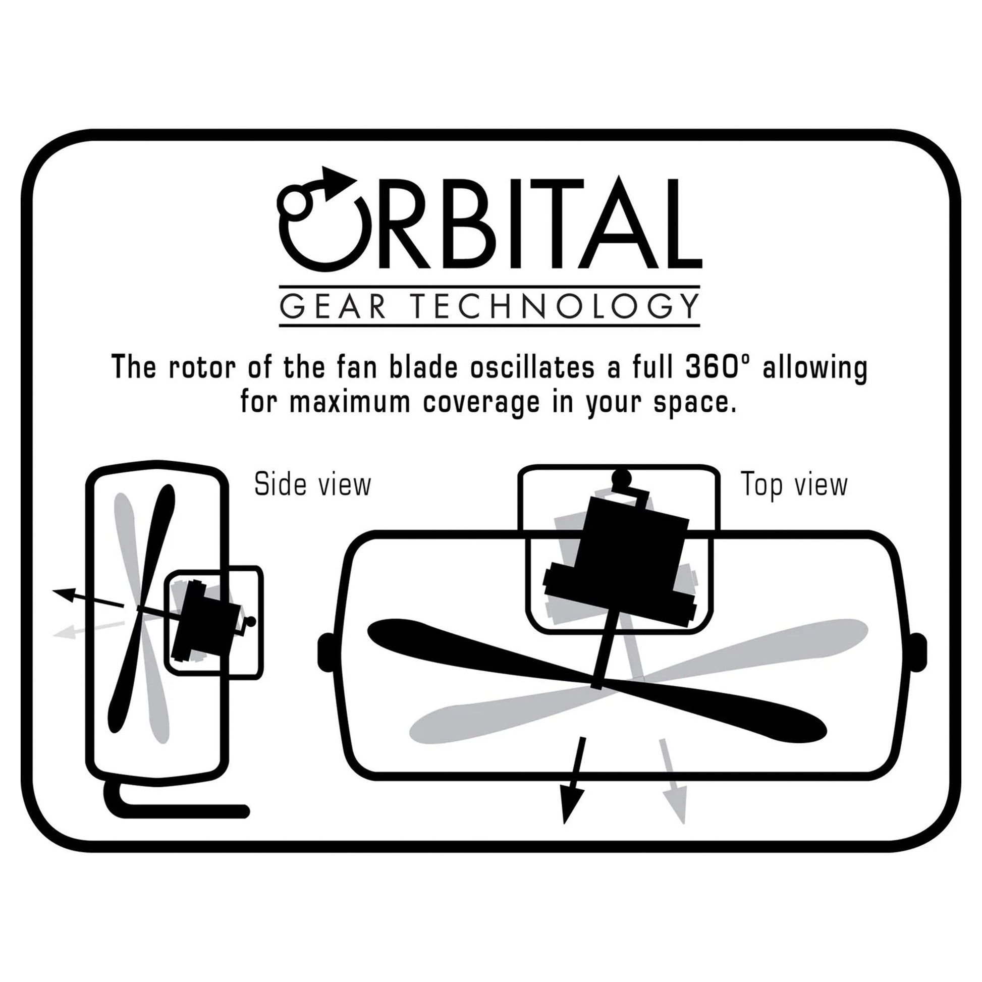 - Showcasing orbital gear technology, the fan's rotor oscillates a full 360 degrees, ensuring maximum coverage in your chosen space and creating a consistent breeze throughout