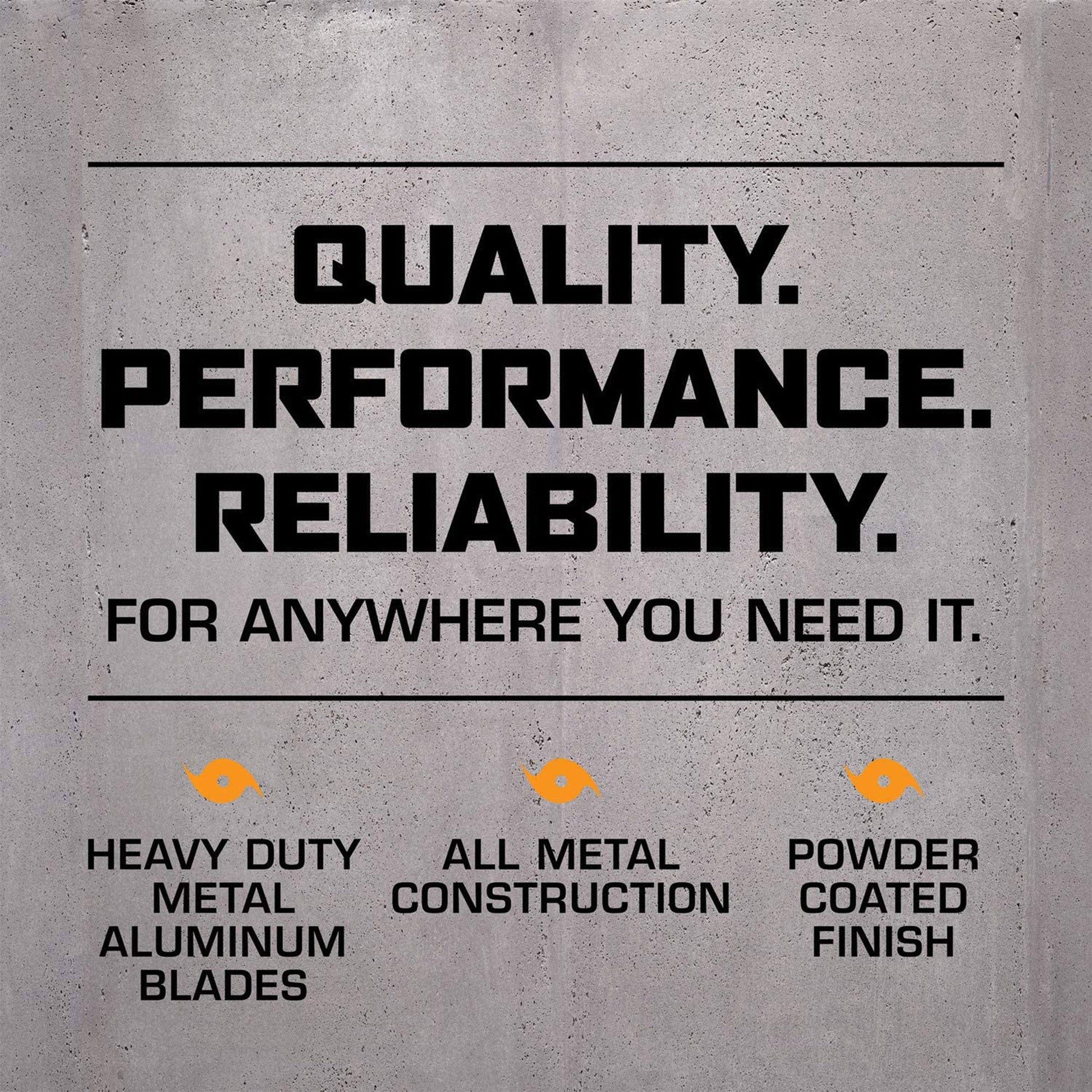 - Features an all-metal construction, sleek black powder-coated finish, and efficient aluminum blades for top-notch durability