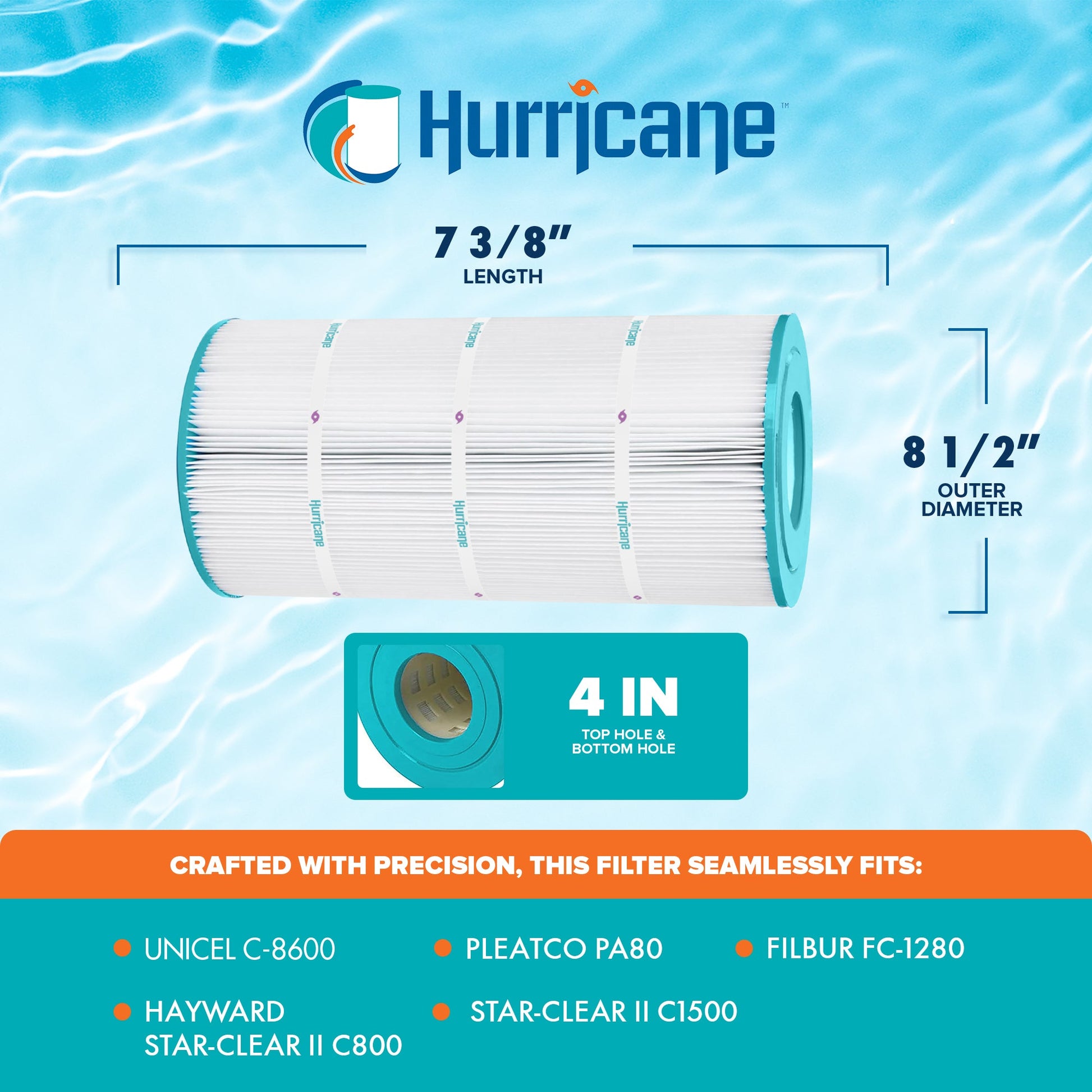 Dive into the realm of pristine waters with the Hurricane HF8600-01 Advanced Cartridge Filters, where unparalleled cleanliness awaits. Crafted with meticulous precision, this filter guarantees seamless compatibility with a range of models including Unicel C-8600, PA80, Filbur FC-1280, Hayward Star-Clear II C800, Star-Clear II C1500, and other compatible models. With dimensions measuring 17.38 inches in length, an outer diameter of 8.5 inches, and top and bottom holes being 4 inches, achieving an ideal fit is effortless, measure your current filter for a flawless match.