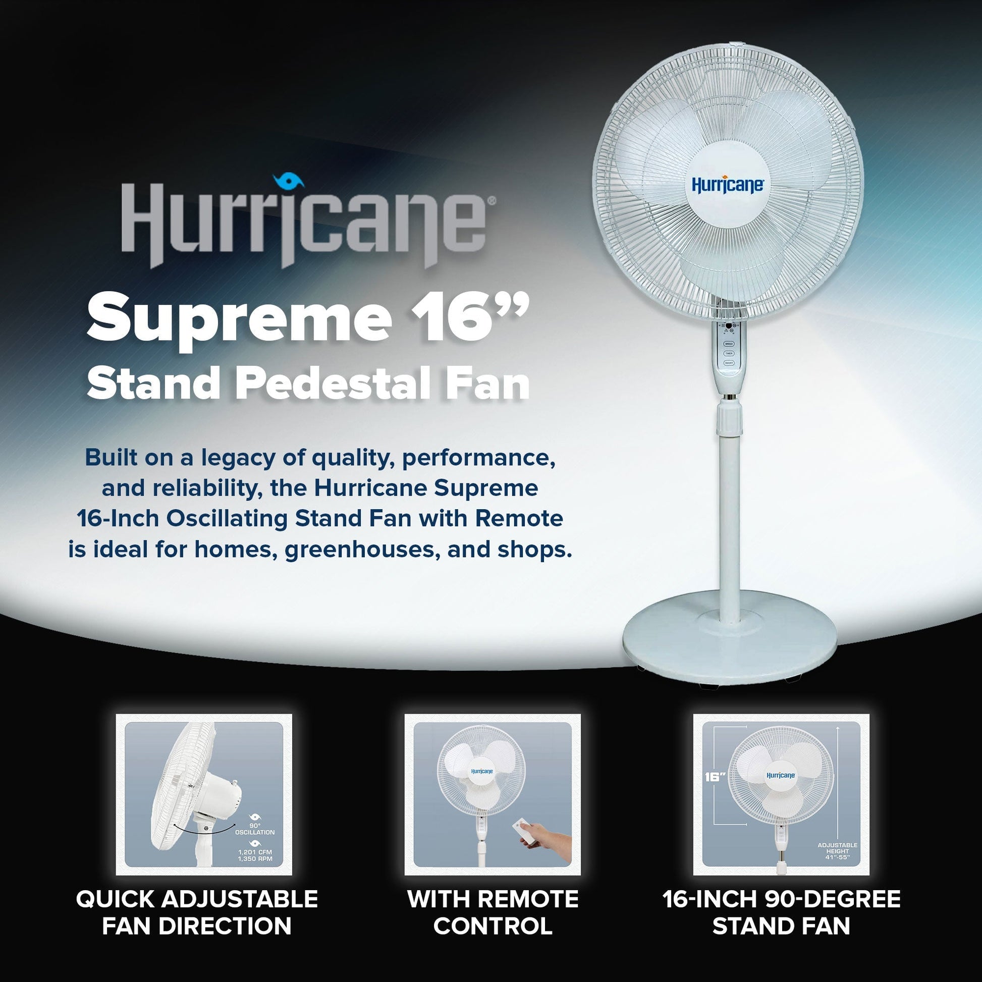 Built on a legacy of quality, performance, and reliability, these Hurricane Supreme 16-Inch Oscillating Stand Fans are ideal for homes, greenhouses, and shops.