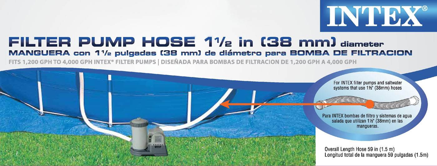 We know that ware and tear happens to all parts, which is why we have the Intex 1.5" Accessory Hose. This **Intex 1.5" Accessory Hose** is suitable for 1500 GPH, and higher, filter pumps and saltwater systems with the correct size fittings. This accessory hose comes complete with nuts on both ends making installation fast and easy. With a 59" length, this accessory hose provides ample length.