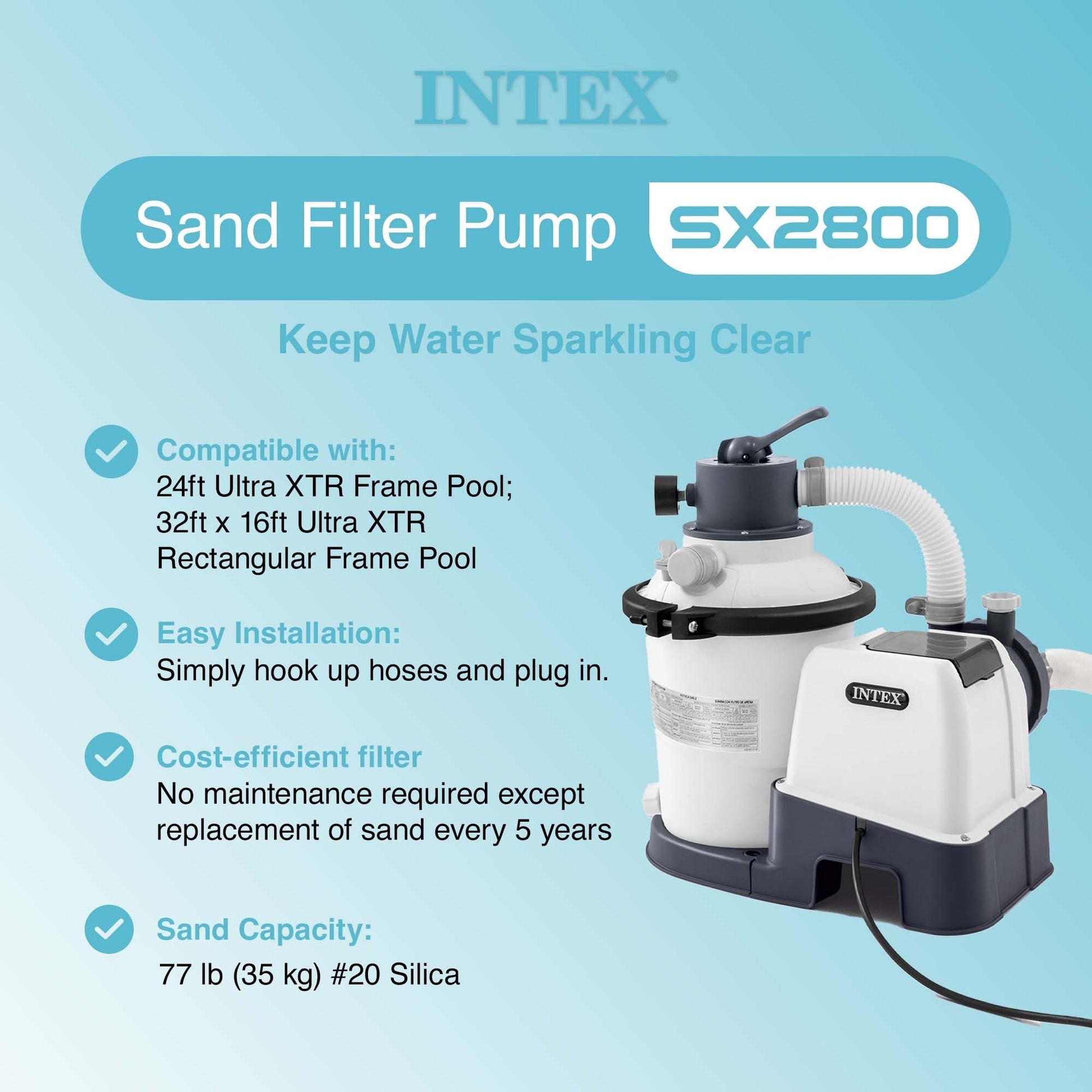 Keep your above ground pool water clean, soft, and refreshing with the Krystal Clear Sand Filter Pump by INTEX. The sand provides excellent water filtration as the 6-function control valve allows the pool owner to: filter, backwash and rinse, recirculate, drain and close the system. The Krystal Clear Sand Filter Pump generates a pump flow rate of 2,800 gallons per hour, ideal for above ground pools. This pump requires virtually no maintenance except replacement of sand every 5 years.