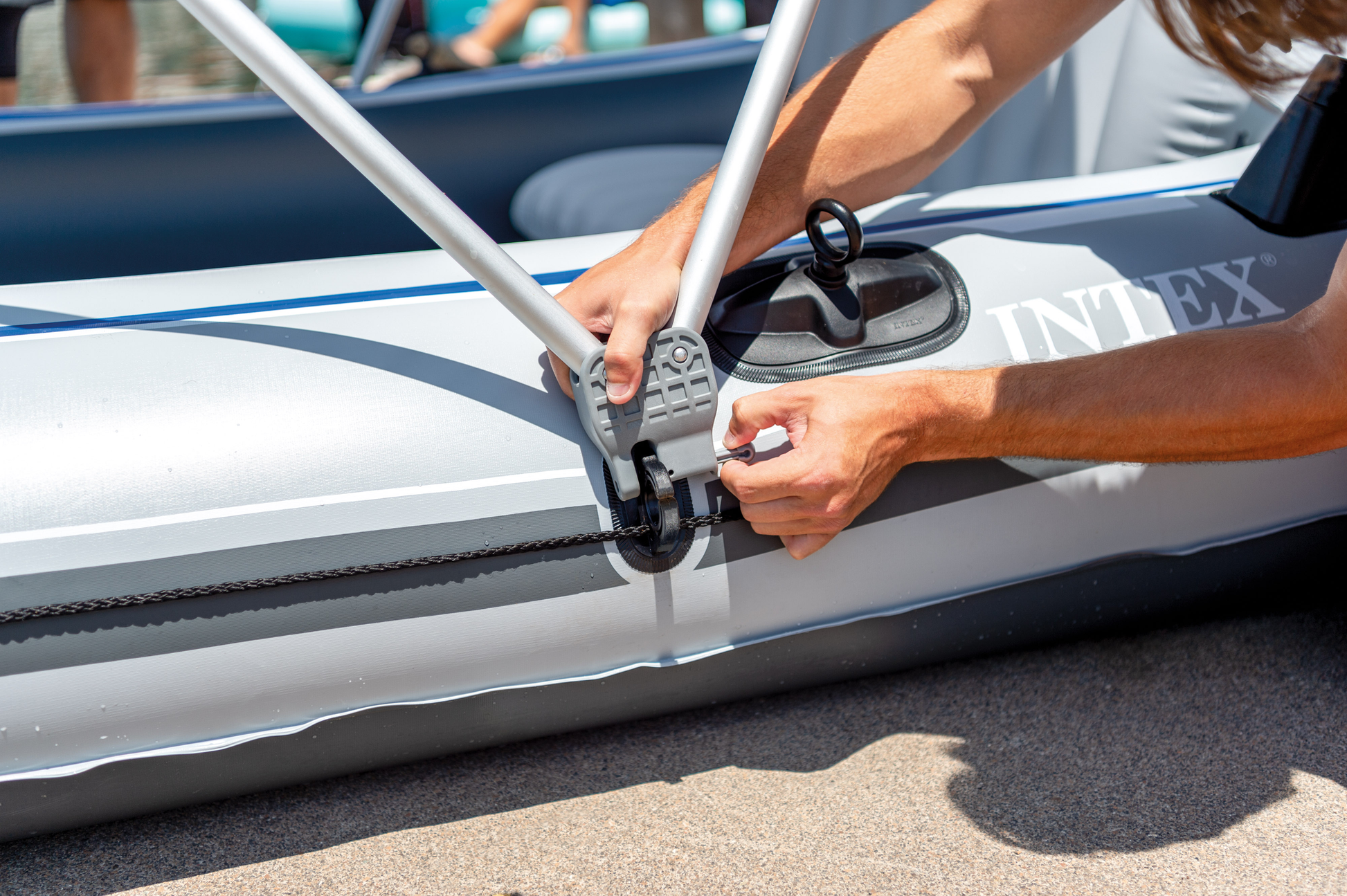 - The easy to store and carry package includes the Excursion 5 boat, 2, 54-inch aluminum oars and an Intex high-output pump for easy inflation and deflation, repair patch kit and carry bag