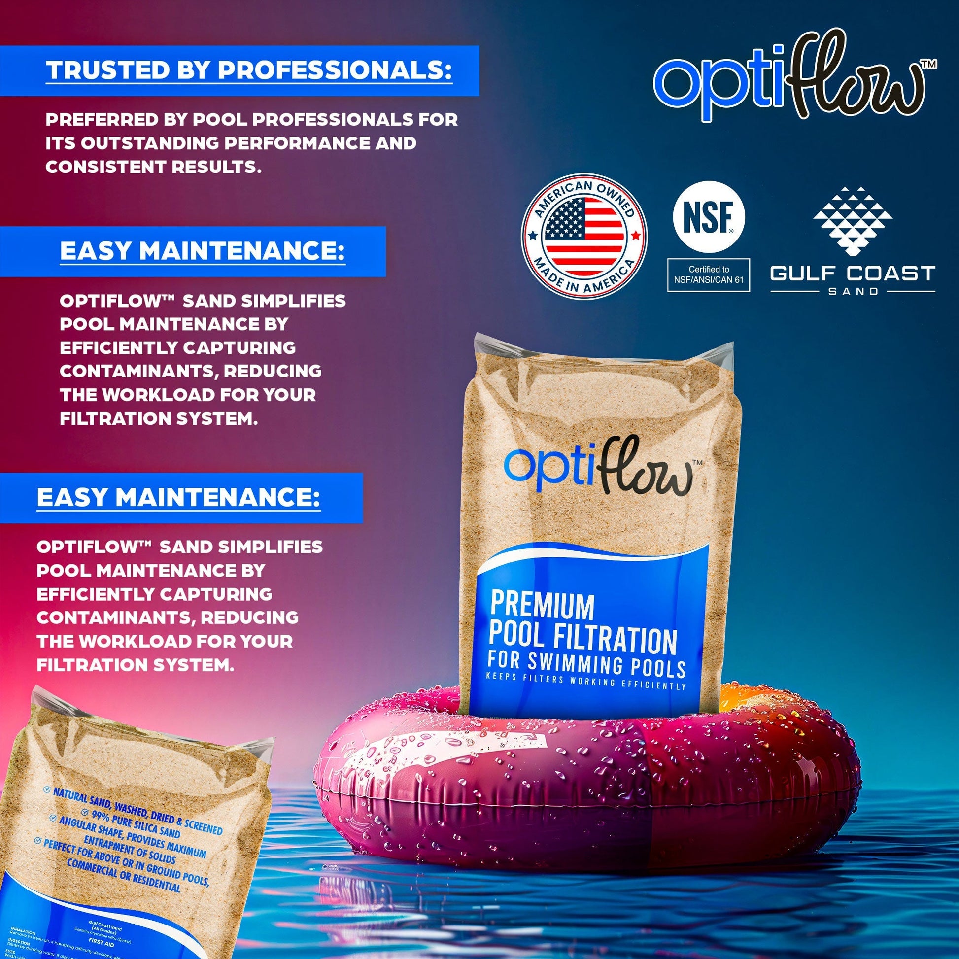 - OptiFlow's pure silica filtration sand formula ensures exceptional water clarity by effectively capturing dirt, debris, and other impurities, keeping your pool pristine