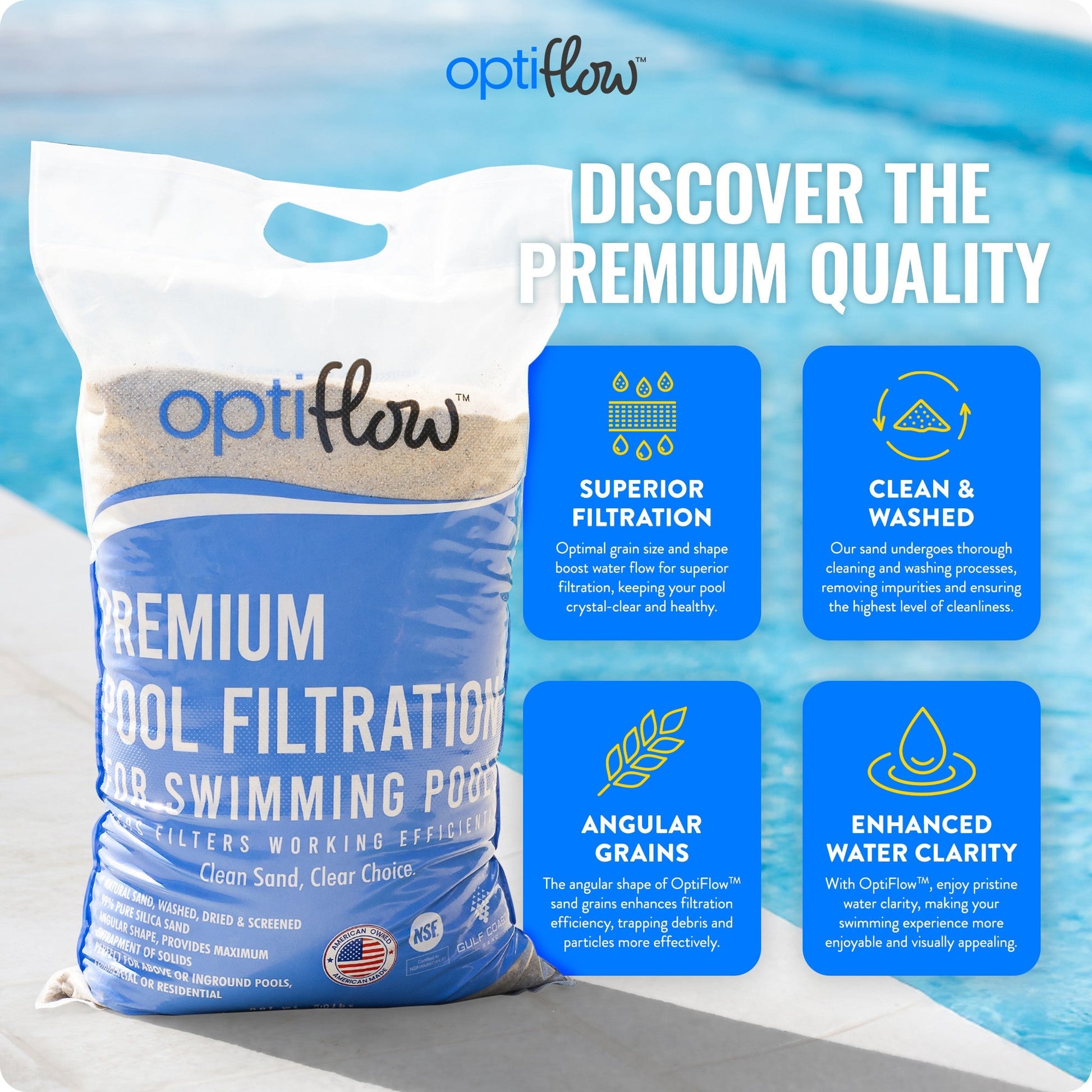 - OptiFlow's pure silica filtration sand formula ensures exceptional water clarity by effectively capturing dirt, debris, and other impurities, keeping your pool pristine