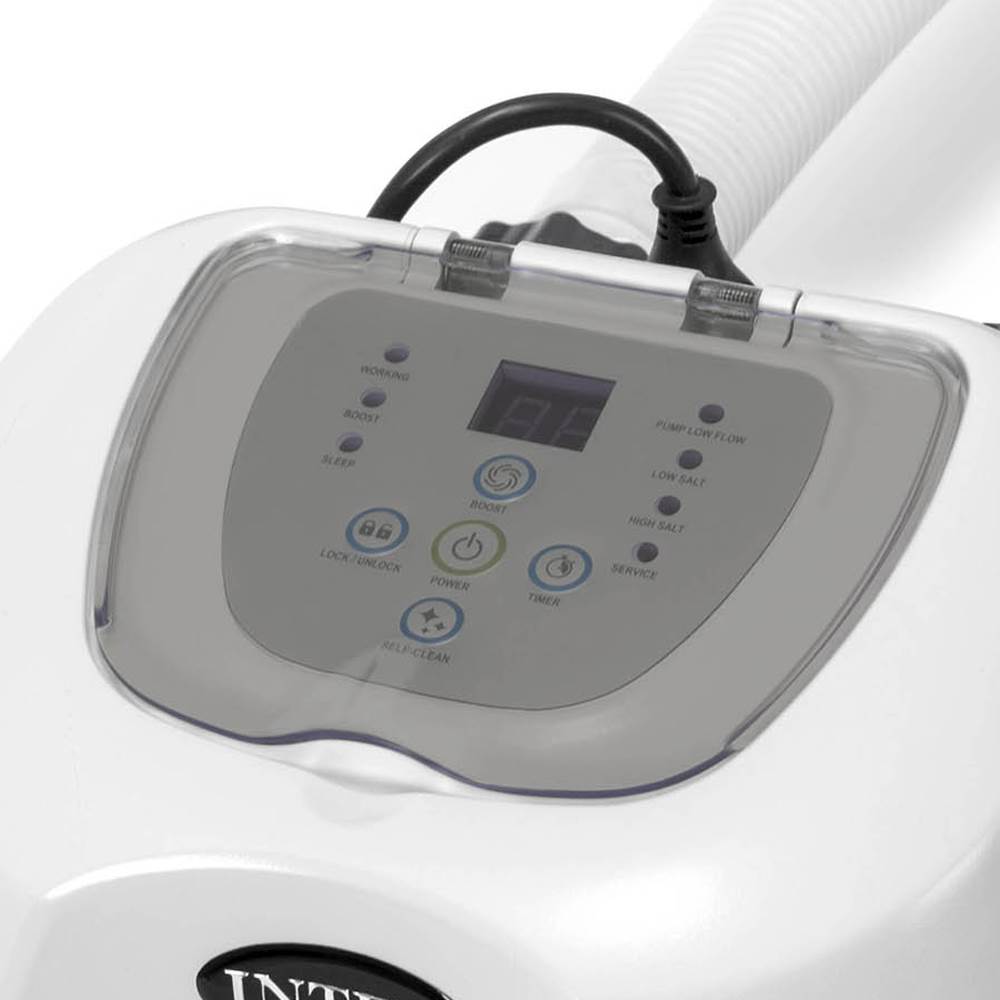 The Intex Krystal Clear Saltwater Systems require a filter pump with a flow rate between 700 and 3,000 GPH and is for use with a maximum pool size of 7,000 gallons. They have an improved control panel with a digital display, easy access buttons, and an added power button for convenience.