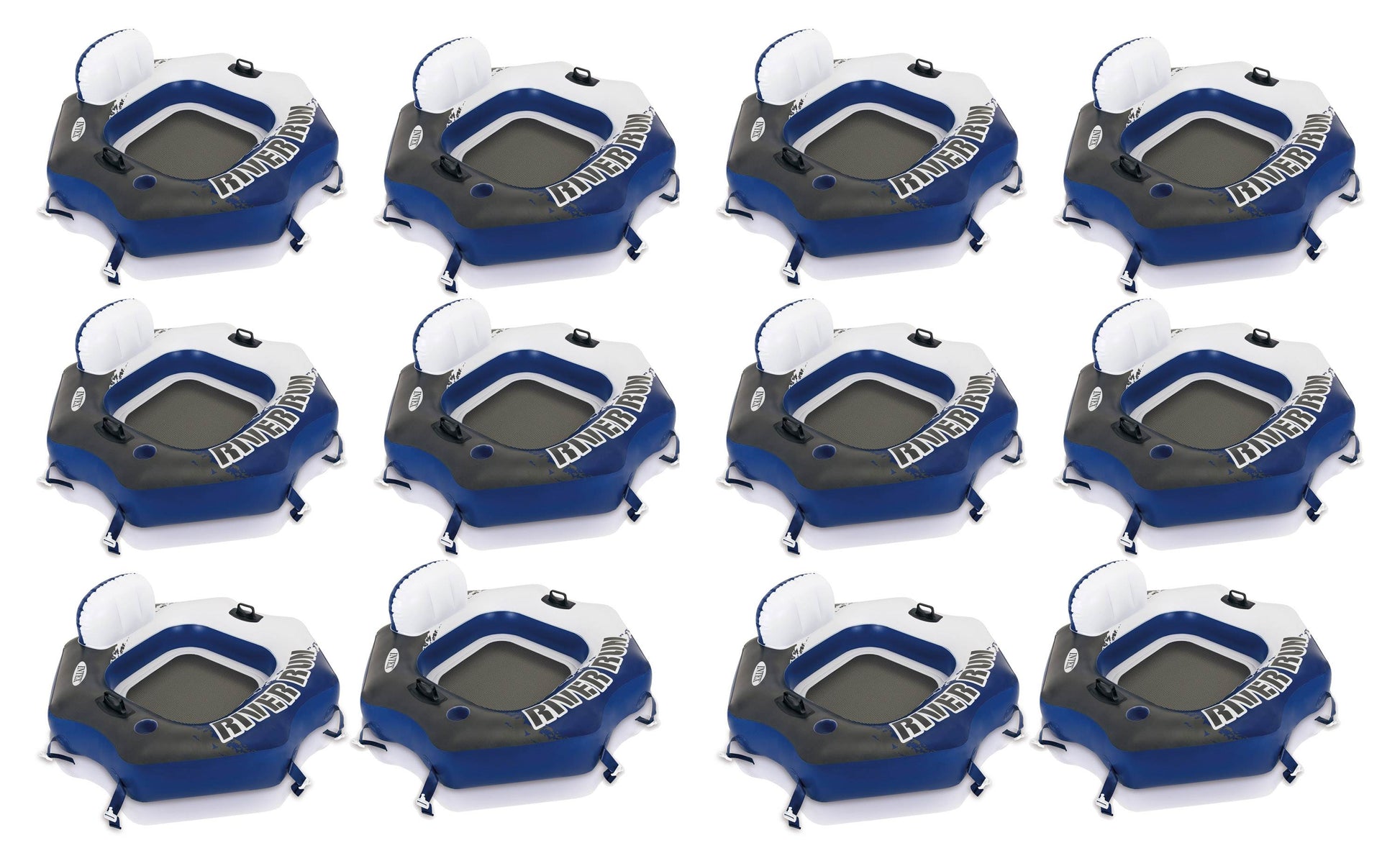 This 12 pack of Intex River Runs includes 12 inflatable tubes designed to fit adults, perfect for tubing down the river, in the lake, or in the pool. The Intex River Run is designed for high performance fun without the hassle of black rubber tubes that can give you tube rash or that uncomfortable burning sensation in hot weather.