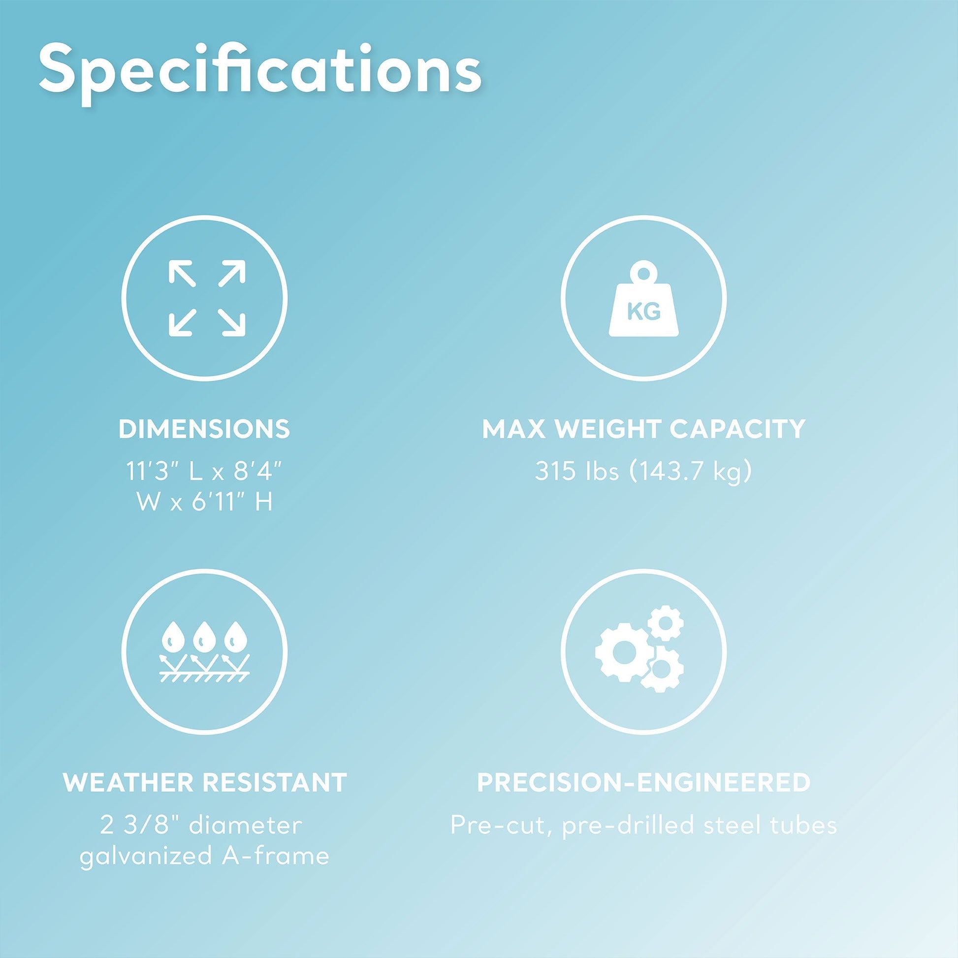 - Sturdy 2-3/8” diameter A-frame construction swing set uses weather-resistant, heavy-duty steel tubes that are powder-coated and galvanized inside and out to ensure long-lasting play