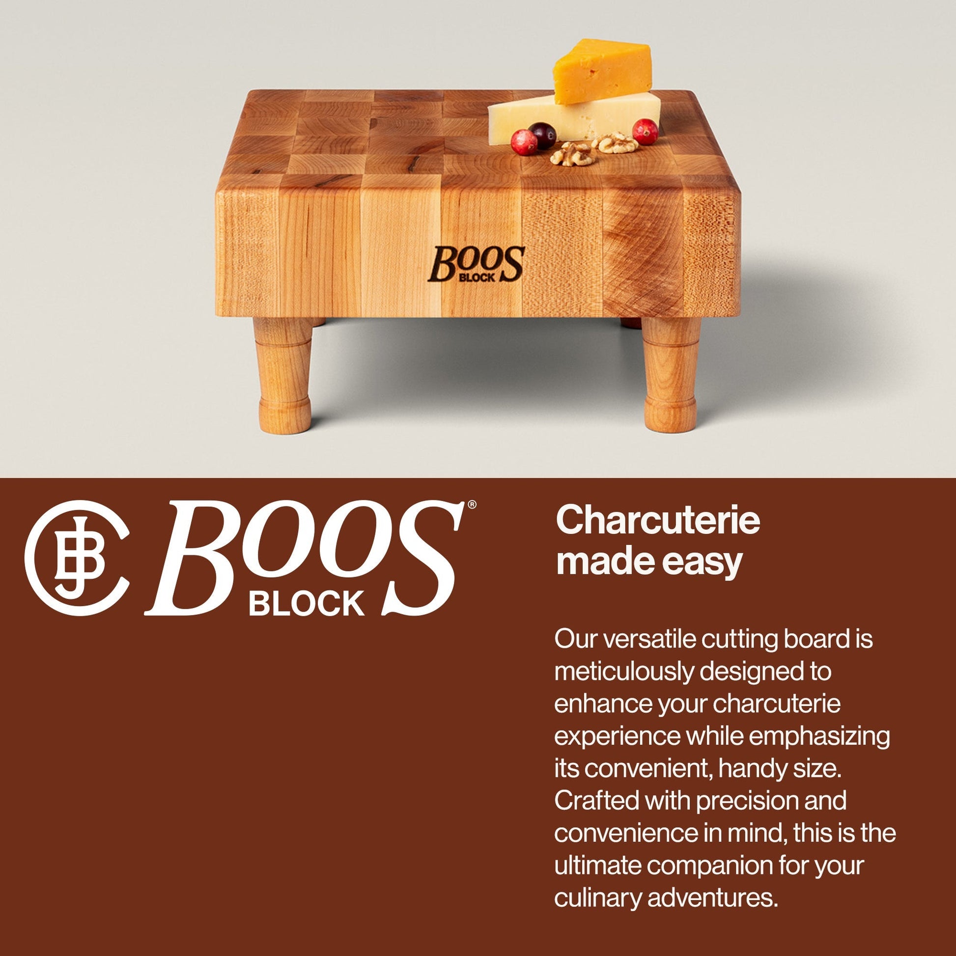 Made in our home and crafted for yours, the John Boos MC series square cutting board with feet is an elegant addition to your kitchen arsenal. Crafted from high-quality wood, this cutting board boasts a substantial 3-inch thickness and is ideal for serving or displaying food in your kitchen or elsewhere, adding a touch of sophistication to any occasion. Whether you use it to cut or serve cheese, bread, pastries, or appetizers, this board is designed to enhance your dining experience and impress your guests. It features a nonreversible design with raised feet for stability and charm. The end-grain construction and oil finish ensure durability and easy maintenance, and the hardwood reflects our commitment to quality.