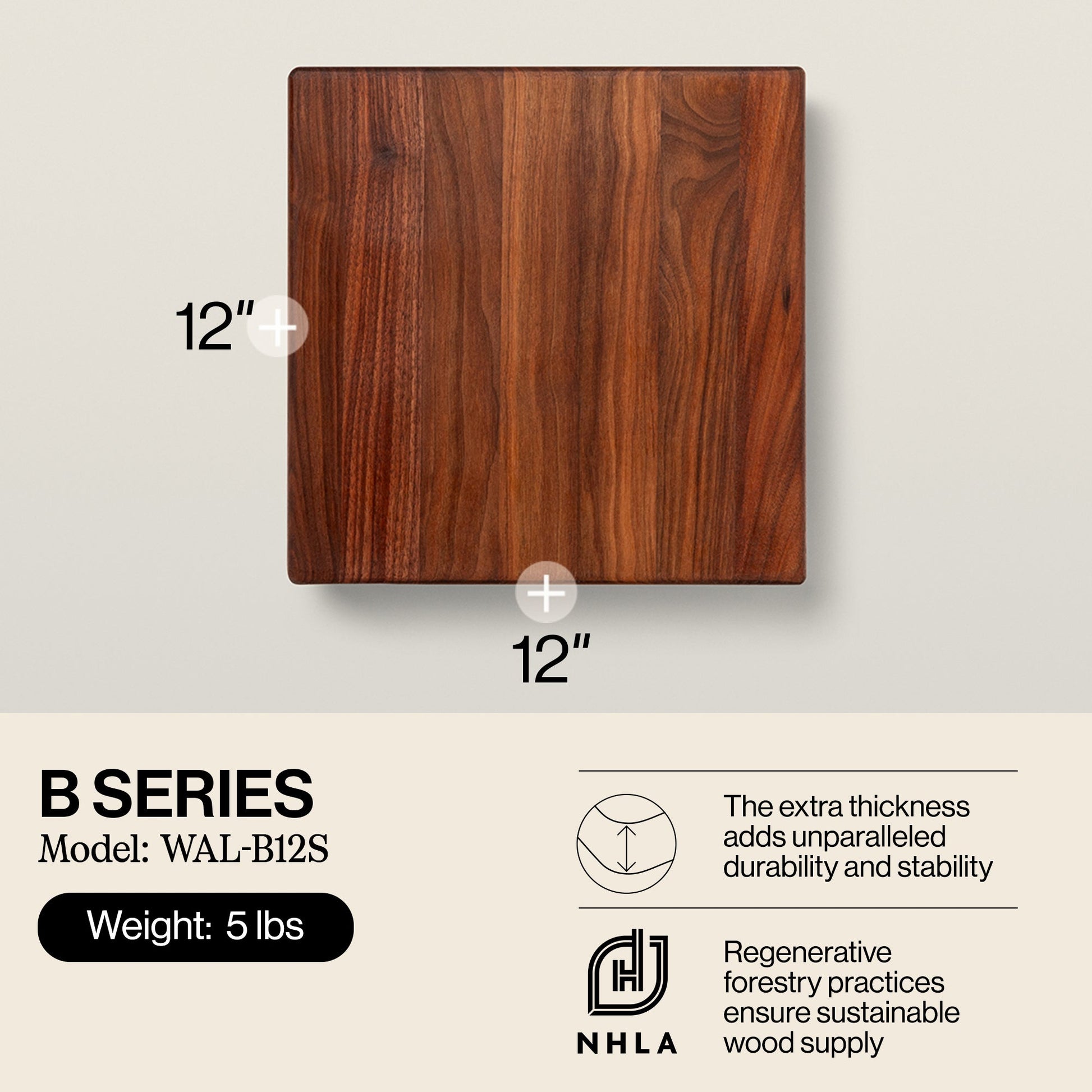 Just any basic cutting board in your kitchen will not do you any good. This wood cutting board measures 12 inches long, 12 inches wide, and 1.5 inches thick so you'll have plenty of space for chopping those essential ingredients. Crafted from hand-selected American black walnut wood, this chopping board exemplifies environmental responsibility and quality craftsmanship.