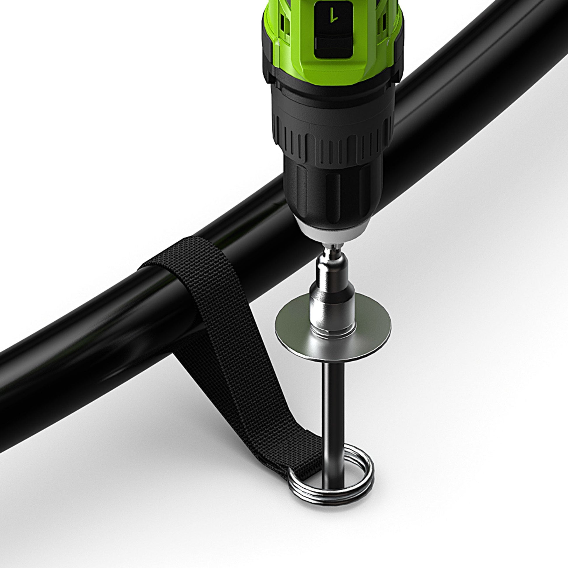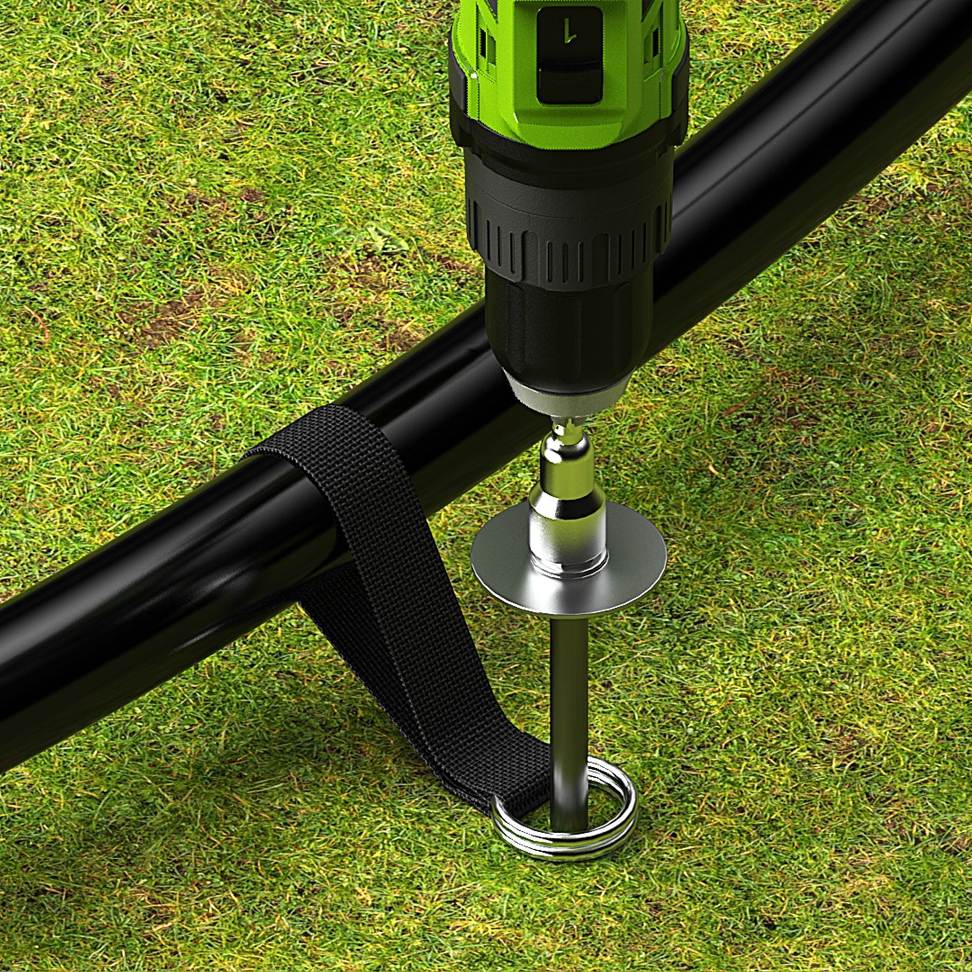 These high-quality screw-in trampoline stakes will ensure that as you rise into the air, your JumpFlex trampoline is right where you left it when you come down for your next liftoff. Easy installation means you'll be set up and ready to securely bounce away to your heart's content. When installed into the ground, the steel construction of the anchoring stakes will be sure to hold strong against high winds or unexpected weather conditions. Simply loop the fastener around the trampoline frame, line up the rings, then use the hand tool or a power drill (power drill not included) to securely screw the anchors into the ground.