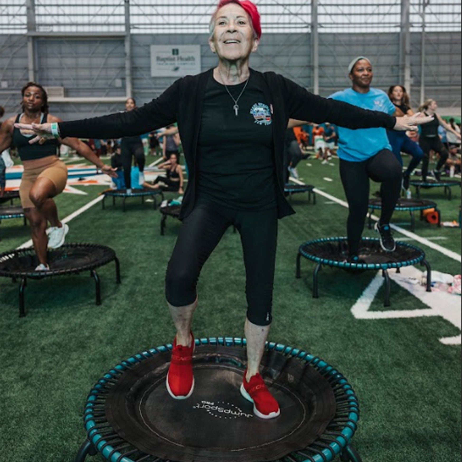 Enhance your cardio workout routine with the JumpSport 350 Pro Fitness Trampoline, ideal for fitness enthusiasts of all levels looking for effective low-impact exercise. Tailor your workouts to meet your fitness goals through various circuits or high-intensity interval training.