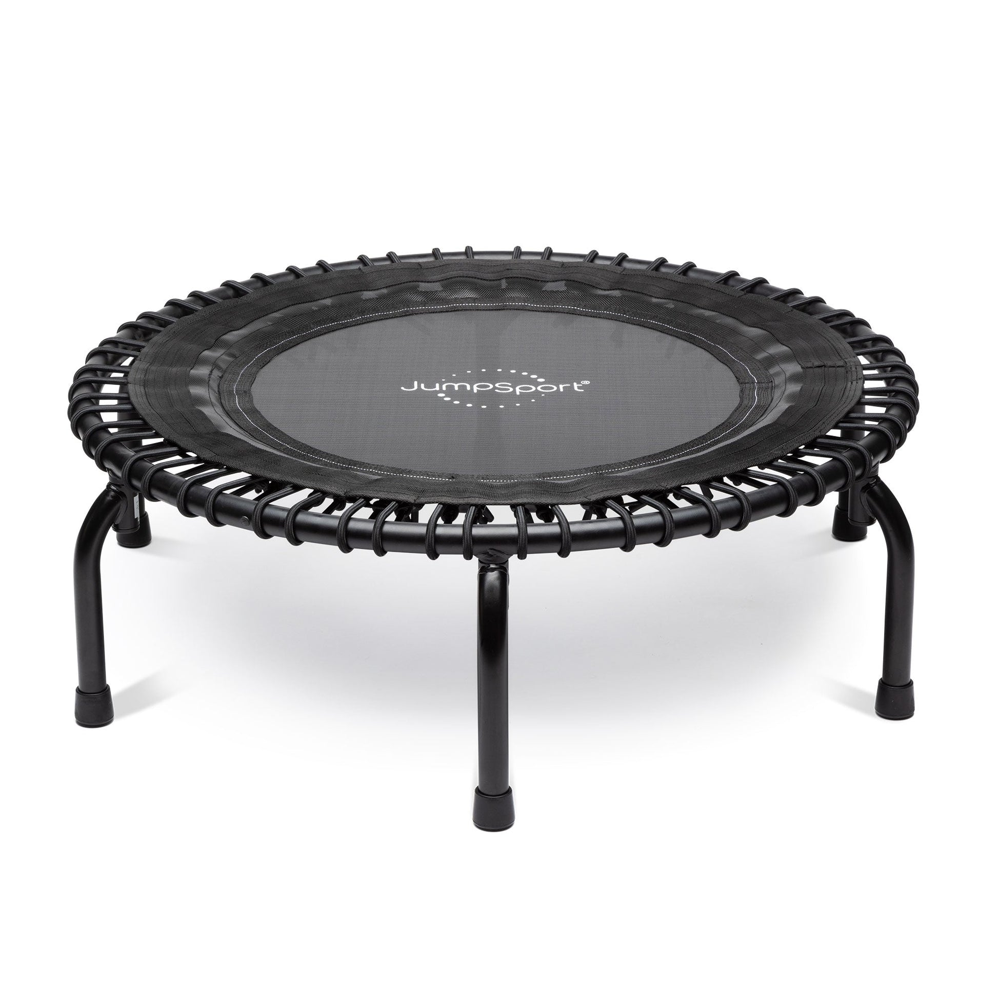JumpSport Fitness Trampolines deliver the smoothest, deepest, and most supportive low-impact bounce on the market. Featuring EnduroLast Elastic Cords, uniquely formulated to stretch 2x resting length, compared to standard bungees that only stretch as little as 1.25x resting length. The 350 has a 32.5-inch jumping surface, arched legs, and 3 easy-to-adjust firmness settings. The JumpSport hinge is light but creates a super stable, rigid frame rail for confident and secure jumping.