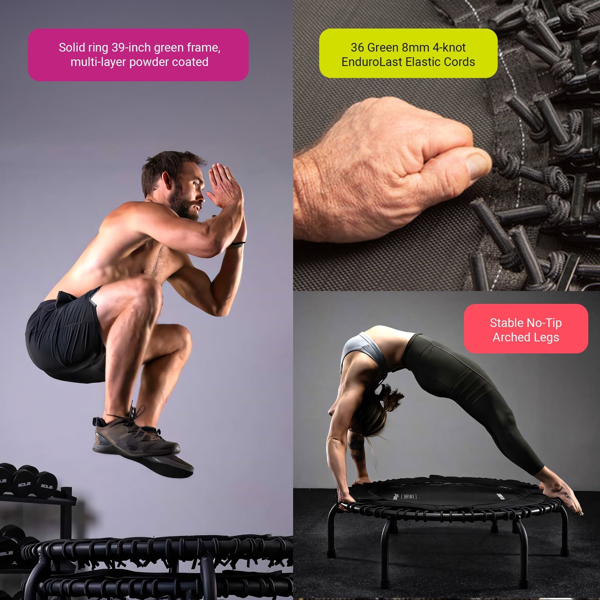 - 39-inch fitness trampoline offers versatility for everyday workouts from high-intensity cardio to sculping and balance work