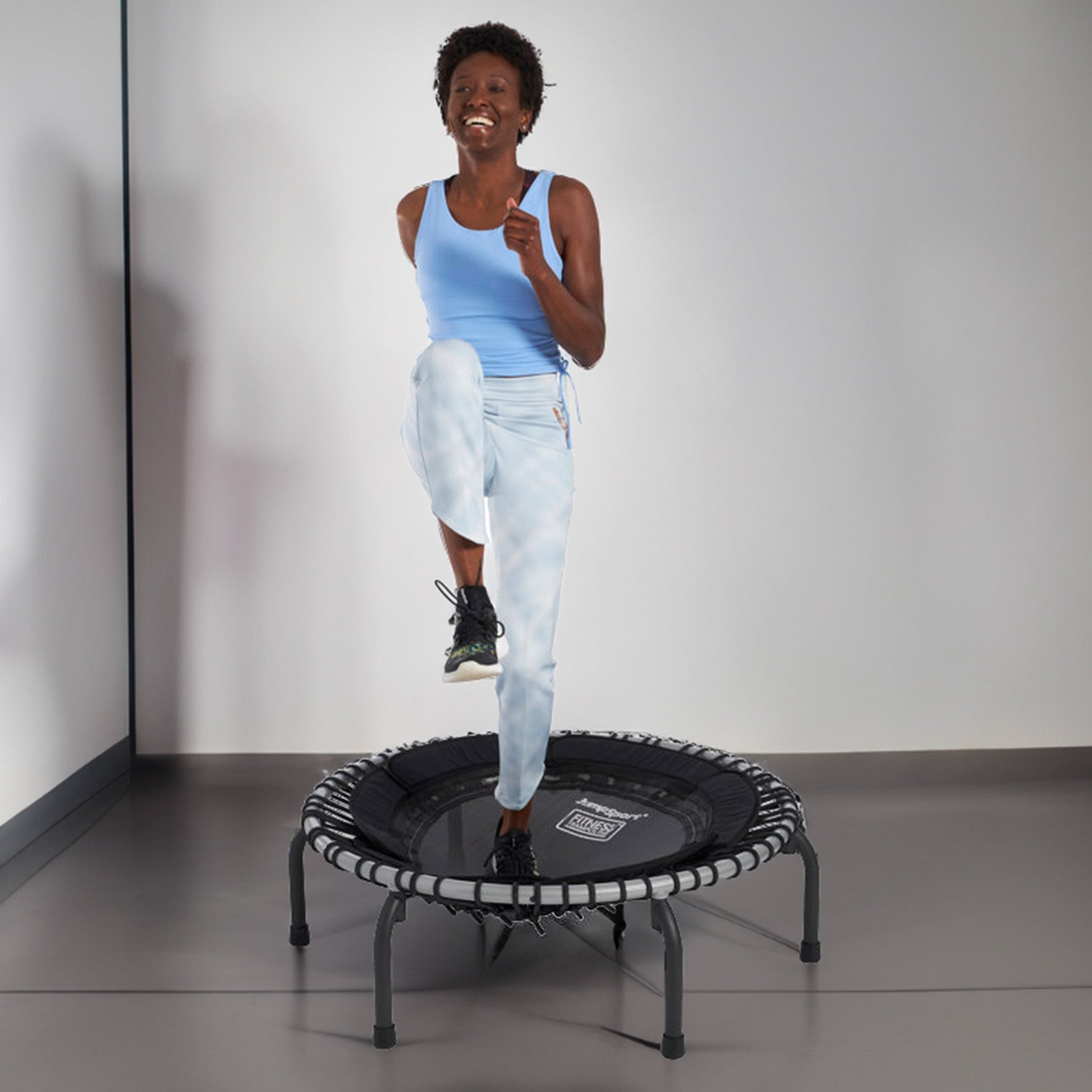 JumpSport Fitness Trampolines deliver the smoothest, deepest, and most supportive low-impact bounce. The 370 has a 35.5-inch jumping surface, arched legs, and 7 easy-to-adjust firmness settings. The JumpSport hinge is light but creates a super stable, rigid frame rail for confident and secure jumping.