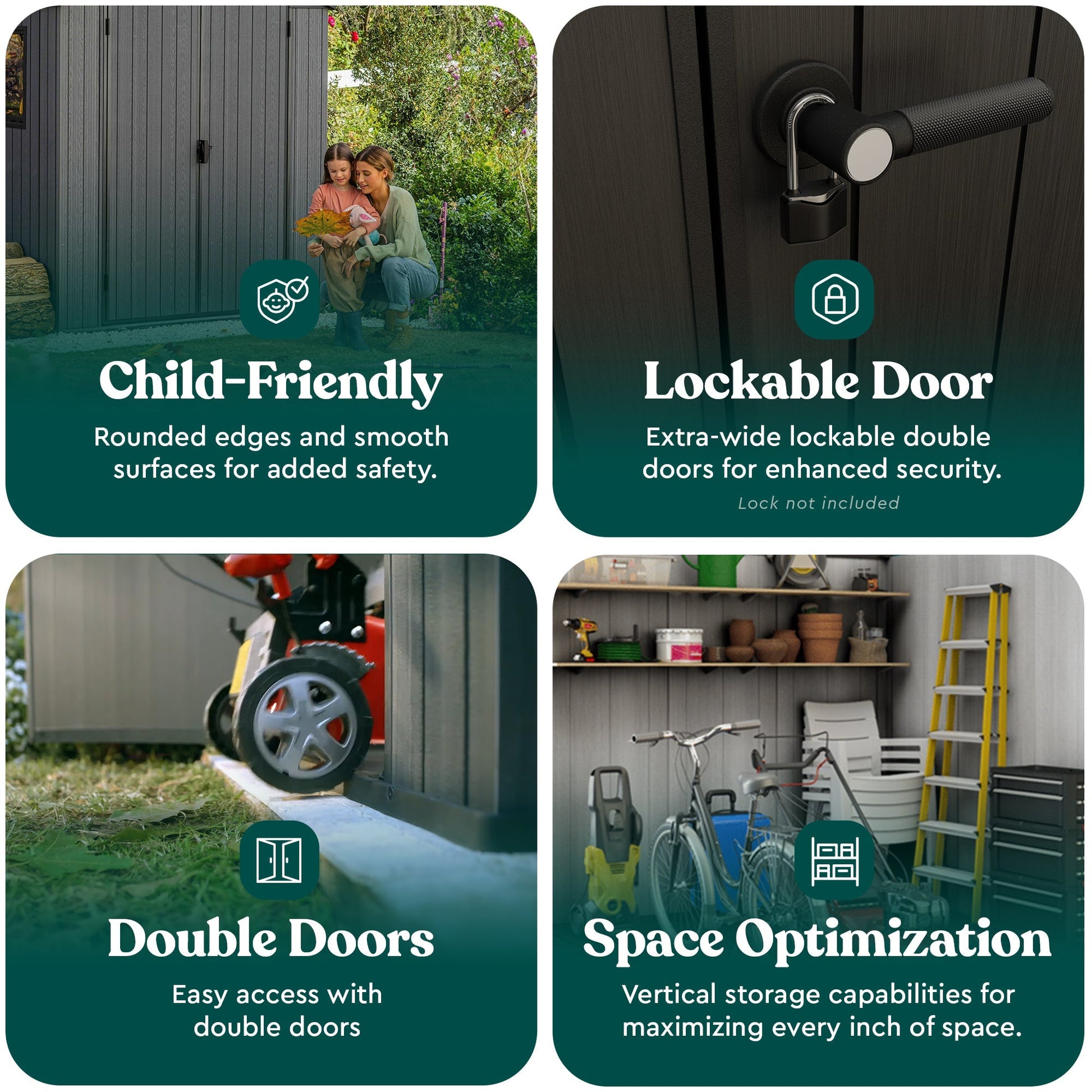 - Built-in vents allow for constant air circulation and help shield the contents of your backyard garden shed from dampness