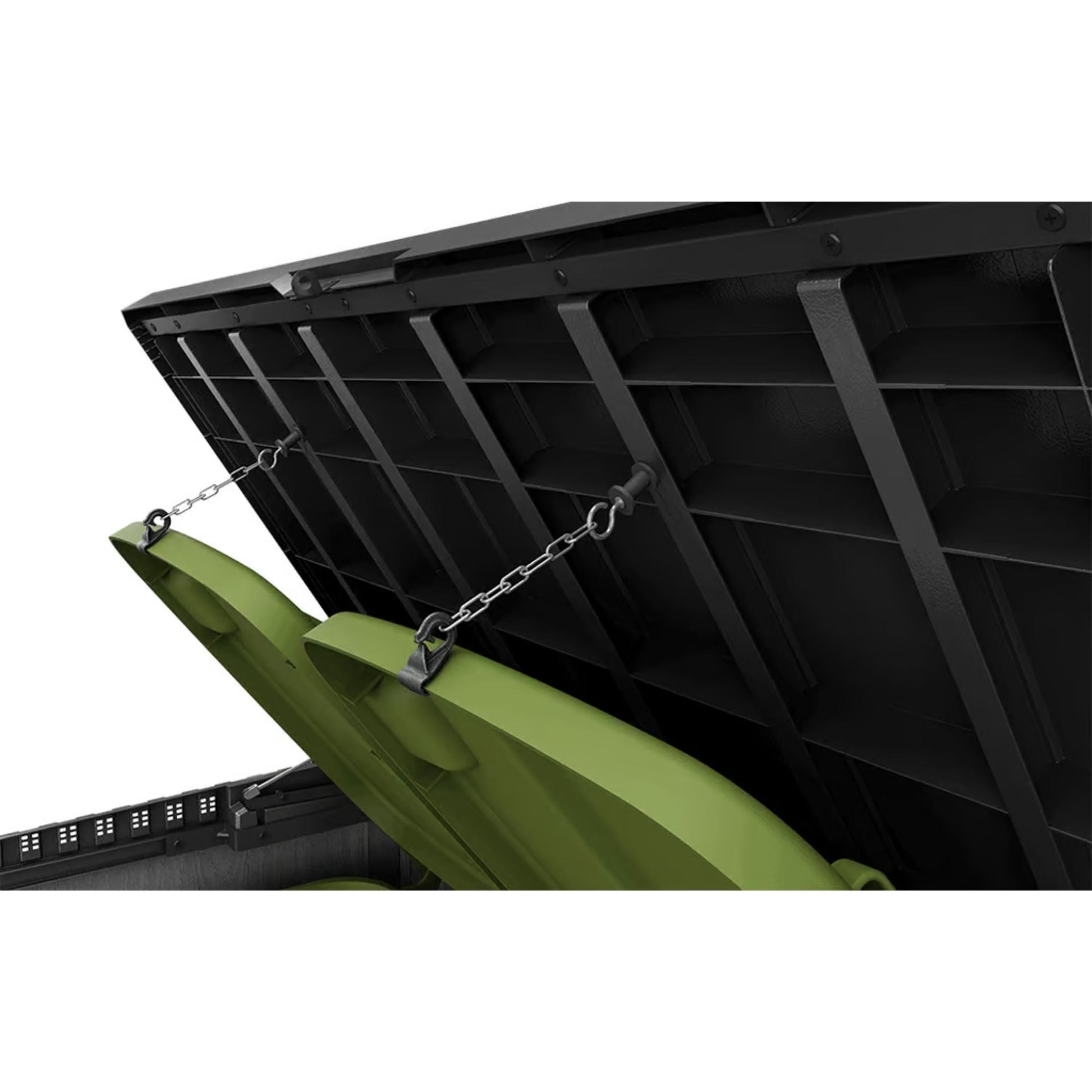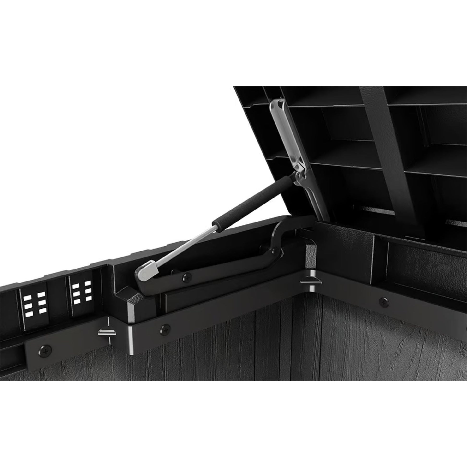 Open the sturdy double doors to reveal a surprisingly spacious interior supported by a heavy-duty floor that keeps items elevated and clean. Built-in shelf brackets allow customization for organized storage, and the included bin-to-lid kit provides convenient access to trash cans or other frequently used items. Hydraulic pistons ensure smooth lid opening while internal ventilation keeps air circulating, helping to maintain the quality of your belongings.