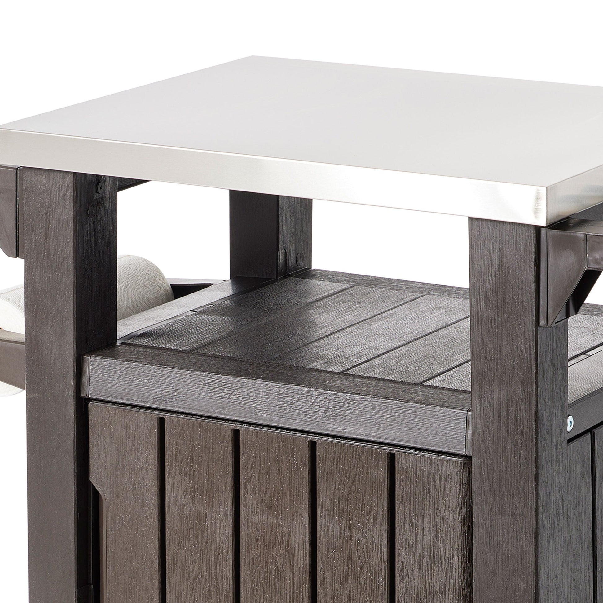 Constructed of weatherproof plastic and a stainless-steel top, these multipurpose carts are ready for whatever life throws at them. The 40 gallons of storage space features 28 gallons of enclosed storage capacity, while the Unity XL features 54 gallons of interior storage and 24 gallons of open storage for a total of 78 gallons of storage capacity. If you need it close to the grill while you're cooking but close to the table when serving, it is easy to move around with 2 caster wheels.
