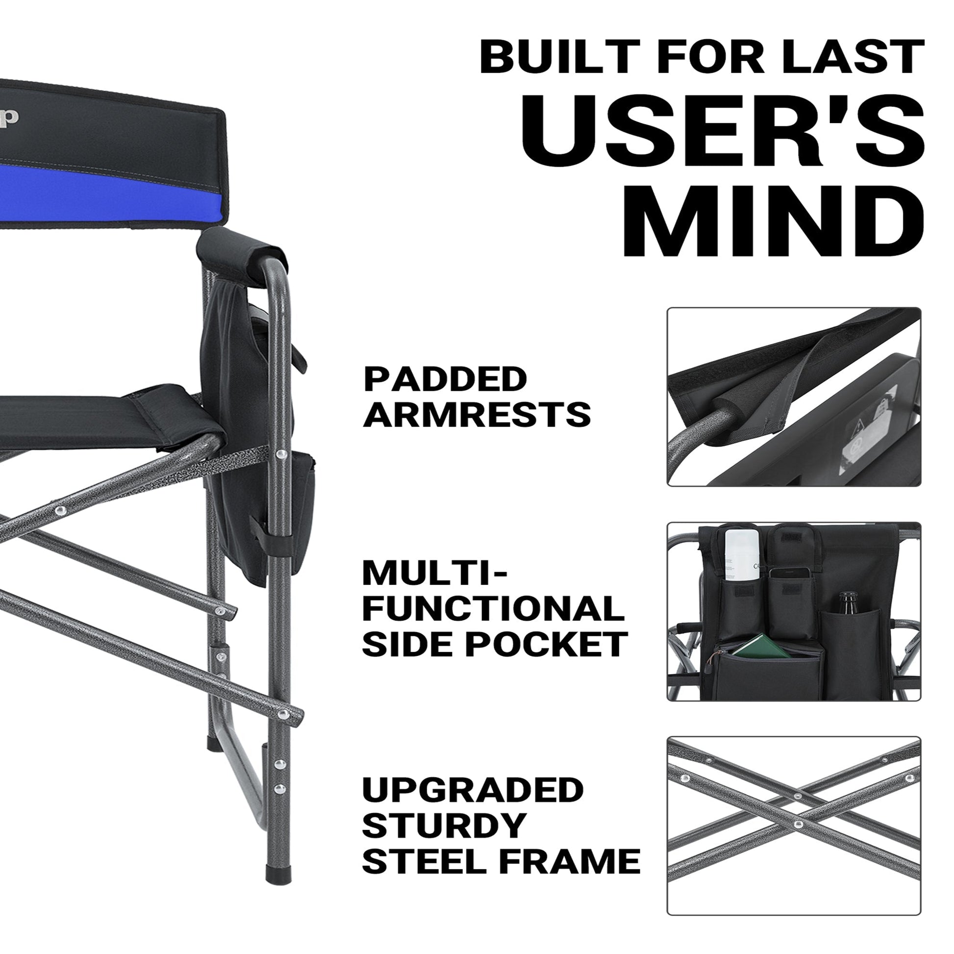 Designed for maximum comfort, these director chairs feature double-layer fabrics with padding covering the armrests and backrest to keep you well-suited throughout your camping journey, while the solid armrests also help you get in and out of the chair with ease.