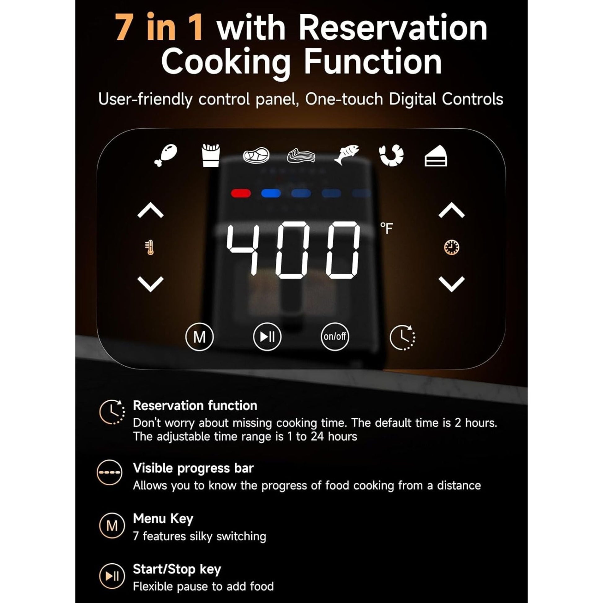The digital display and 7 intuitive presets make operation easy, even for beginner cooks. With a wide temperature range from 150 to 400 degrees Fahrenheit, it gives you the versatility to bake, roast, or air fry with precision. No preheating means less time waiting and more time enjoying your meals. And with its nonstick, dishwasher-safe basket, cleanup is as effortless as cooking.