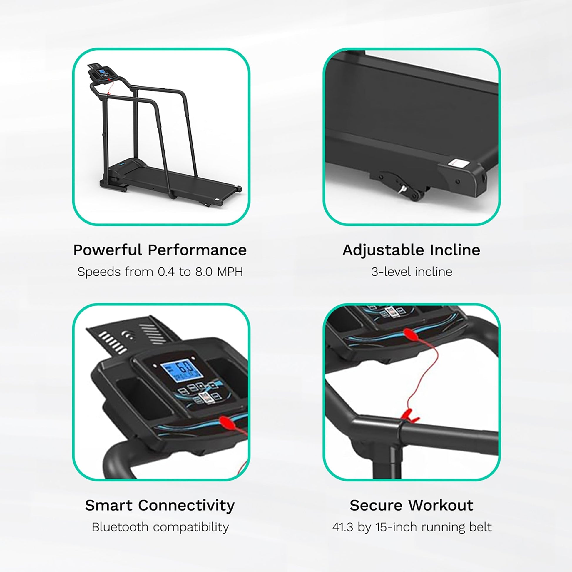 - Shock Absorption & Joint Protection: The treadmill's low-profile running deck with integrated shock absorption technology reduces the impact on joints, making it perfect for walking or jogging while minimizing strain.