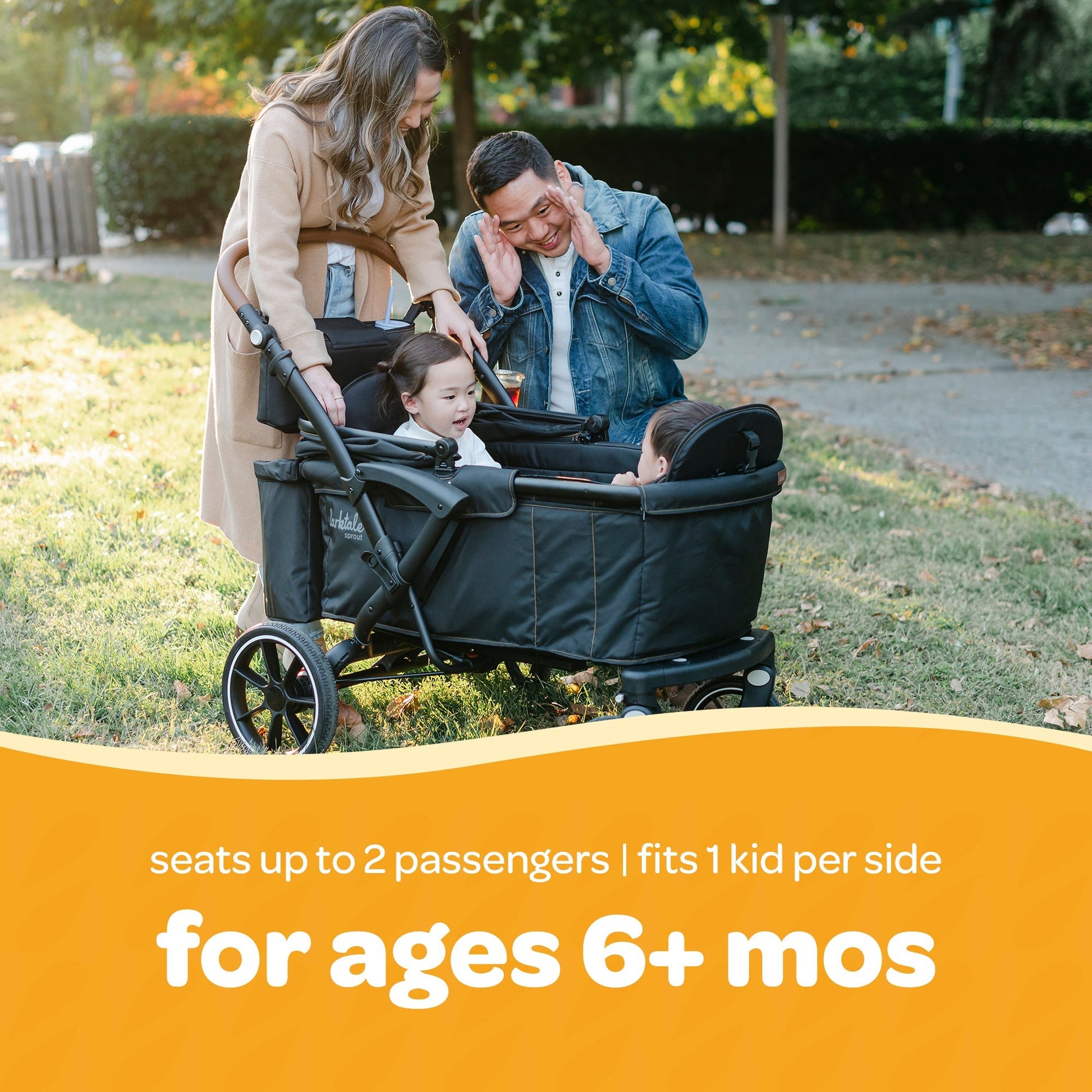- Expands from a single-seat stroller to a double-seat wagon, accommodating kids from 6 months up to 50 pounds per seat