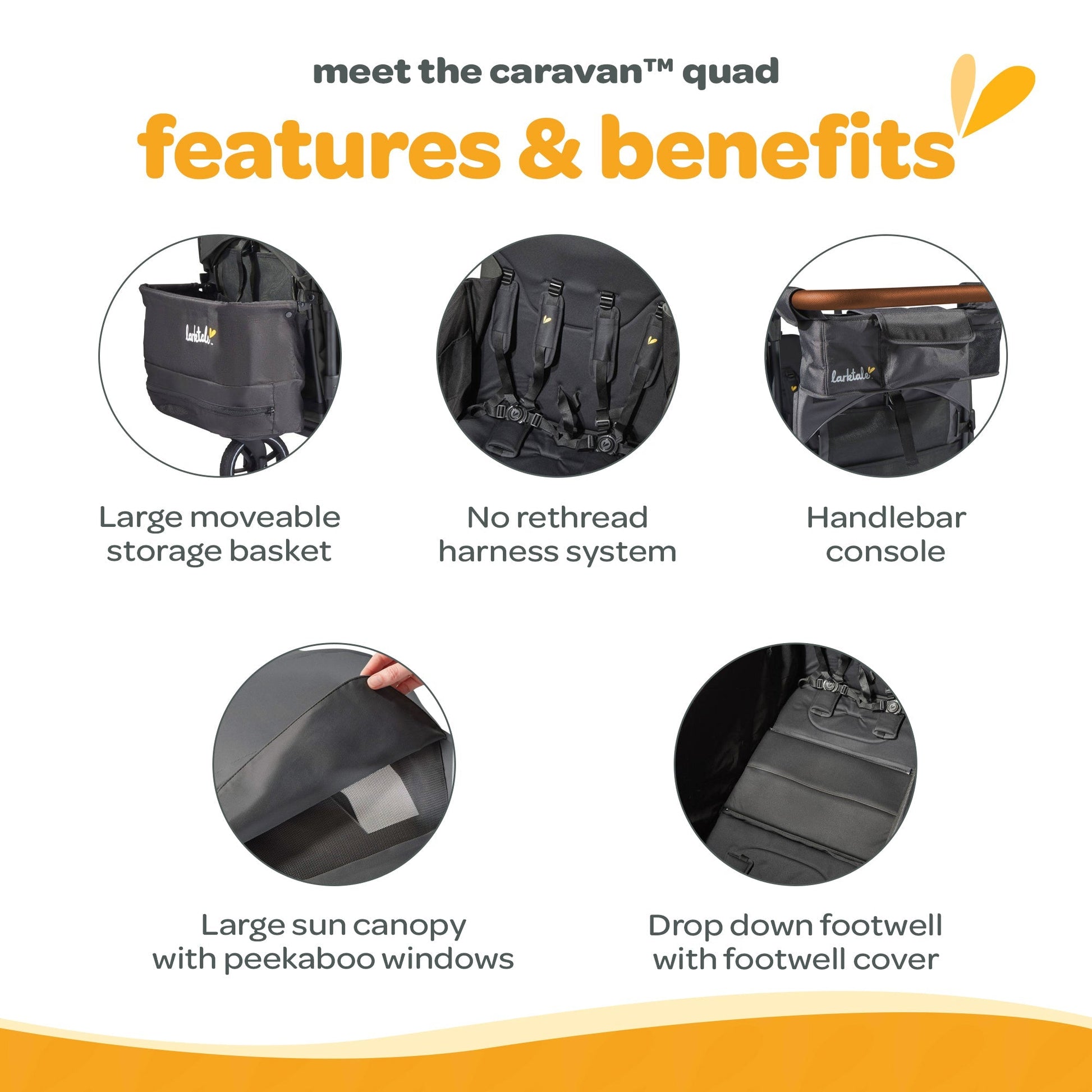 Elevate your family adventures with the Larktale Caravan Quad Stroller/Wagon, where comfort, safety, and convenience converge to create the ultimate strolling experience.