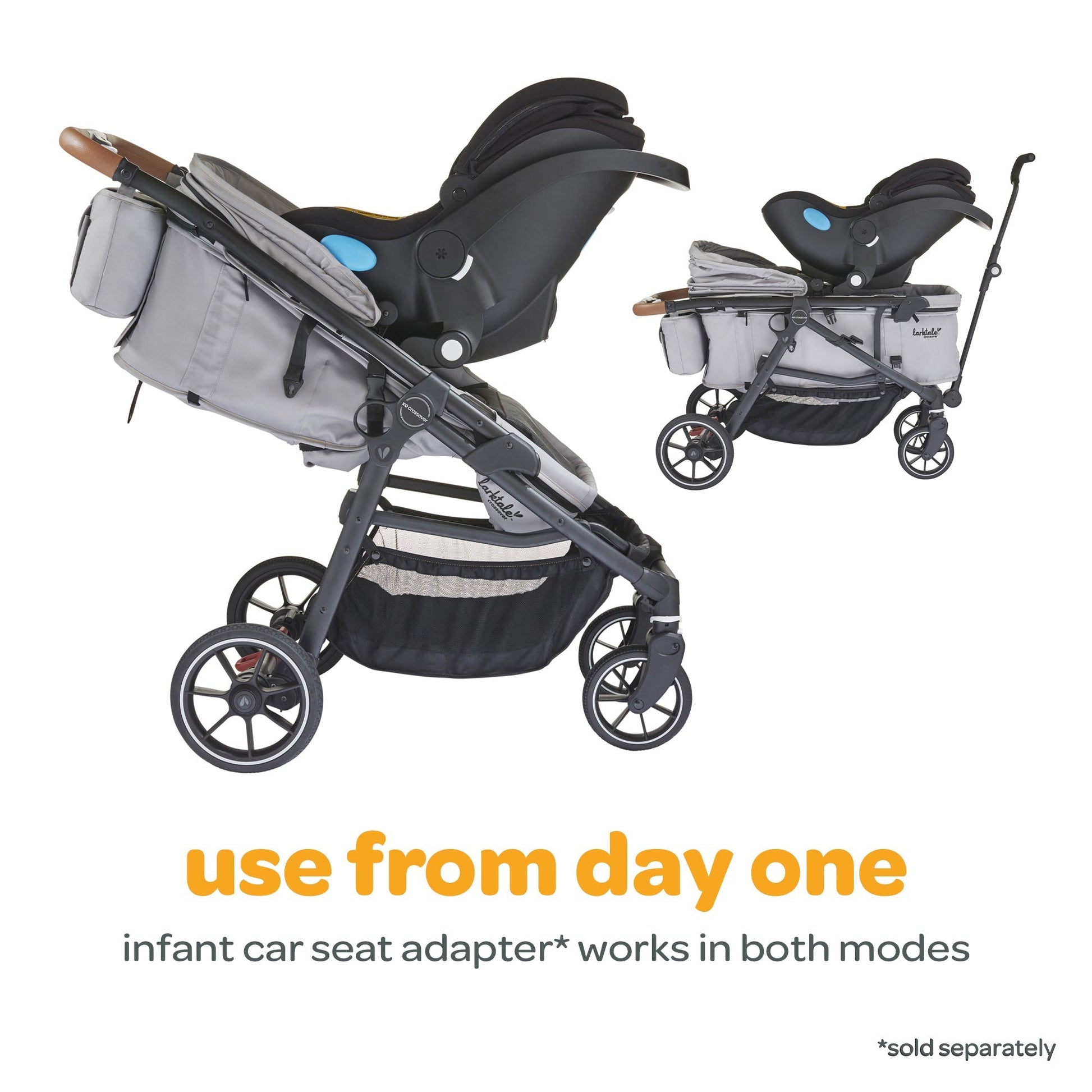 - Stroller seamlessly converts from a full-featured single stroller to a single or double-seater pull wagon with no tools or extra conversion kits needed