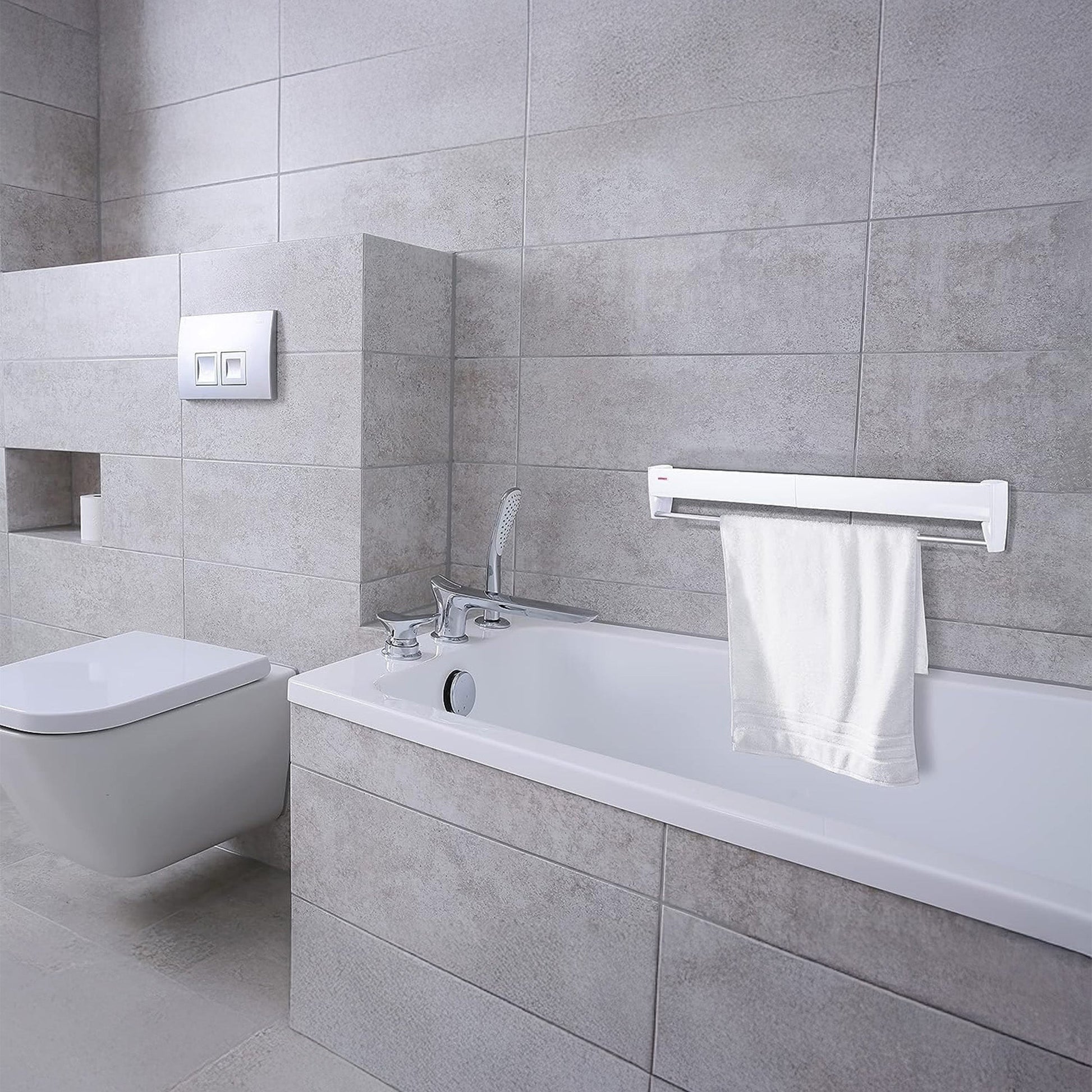 - When not in use, the dryer folds away neatly, leaving just a sleek aluminum towel bar visible - perfect for small bathrooms and laundry rooms.
