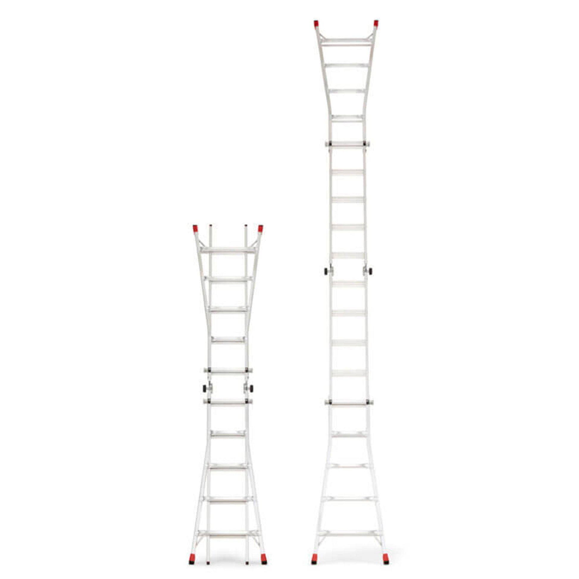 - Seamlessly transitions into 5 distinct ladder types ranging from an adjustable-height dual-sided stepladder, extension ladder, stairway ladder, 90-degree wall ladder, and scaffold bases for varied tasks and environments