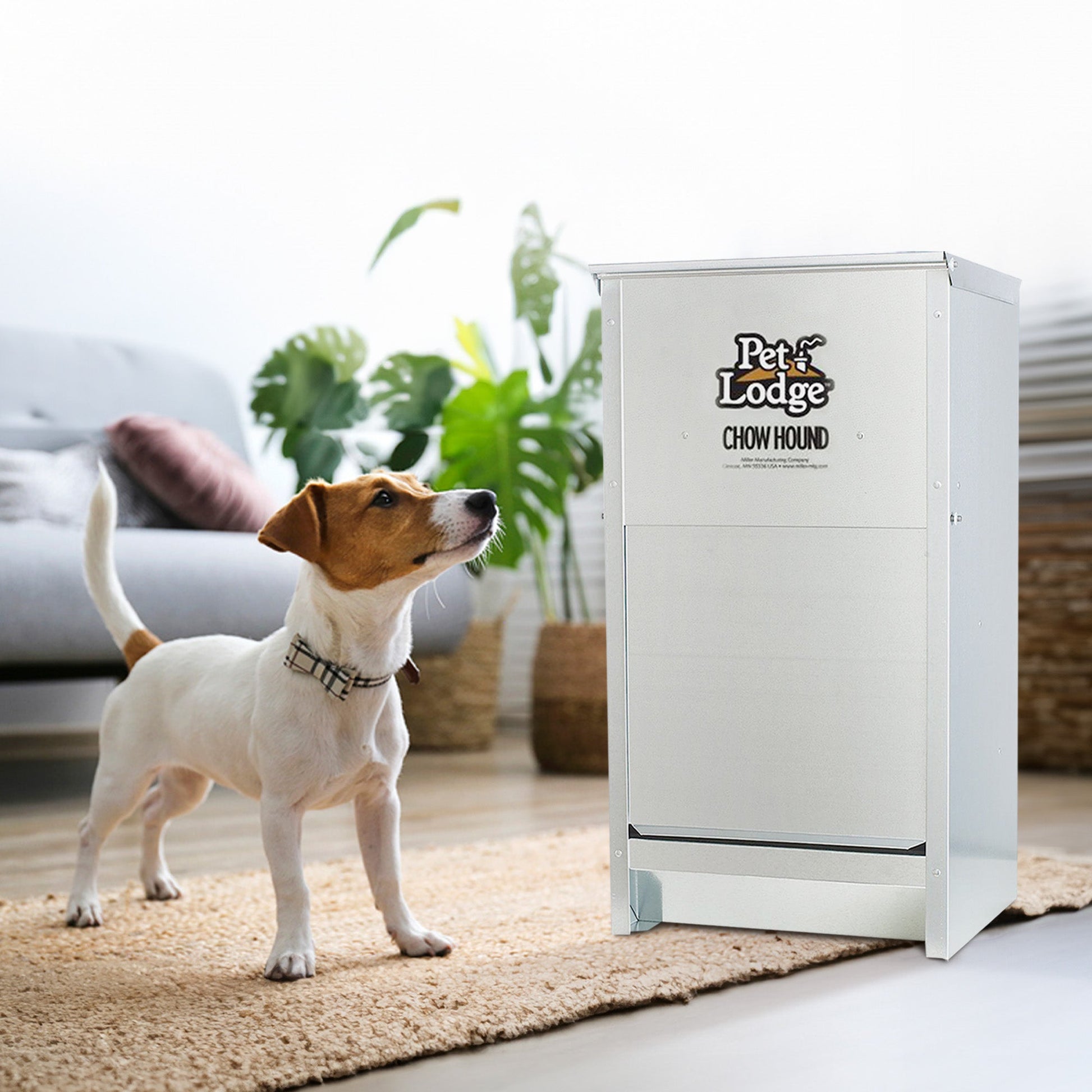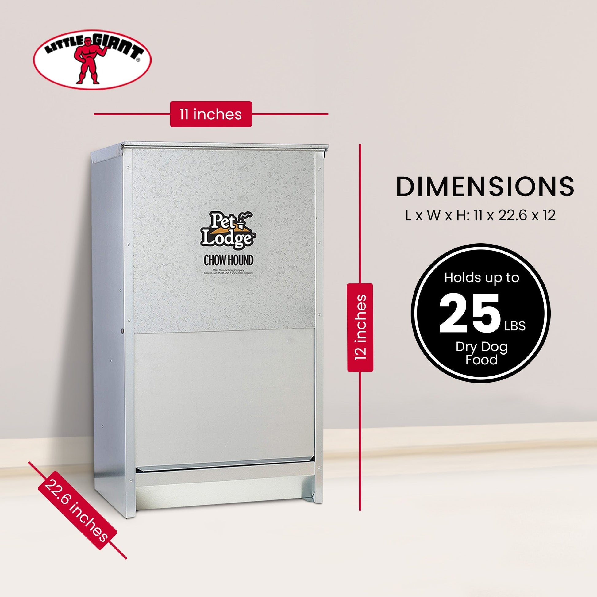 The Automatic Pet Feeder can hold 25 pounds of dry dog food. Great for indoors or outdoors, the Little Giant Automatic Dog Feeder Chow Hound 4 Pack will become your dog's new best friend.