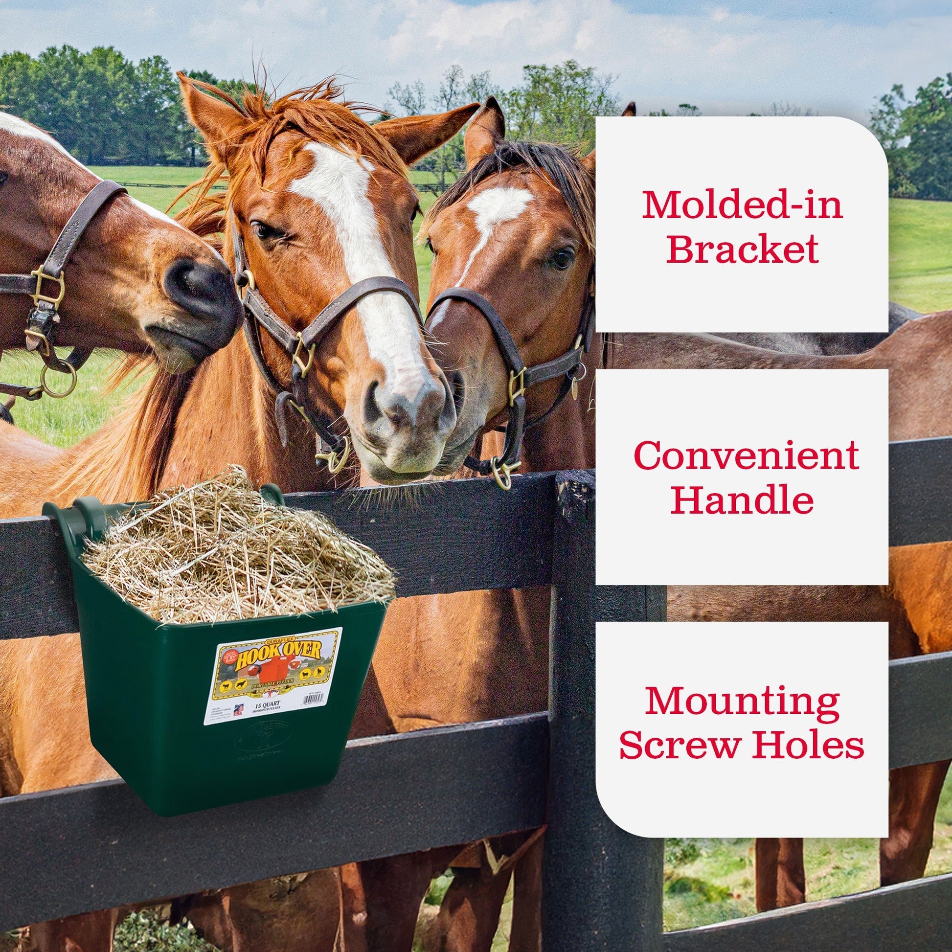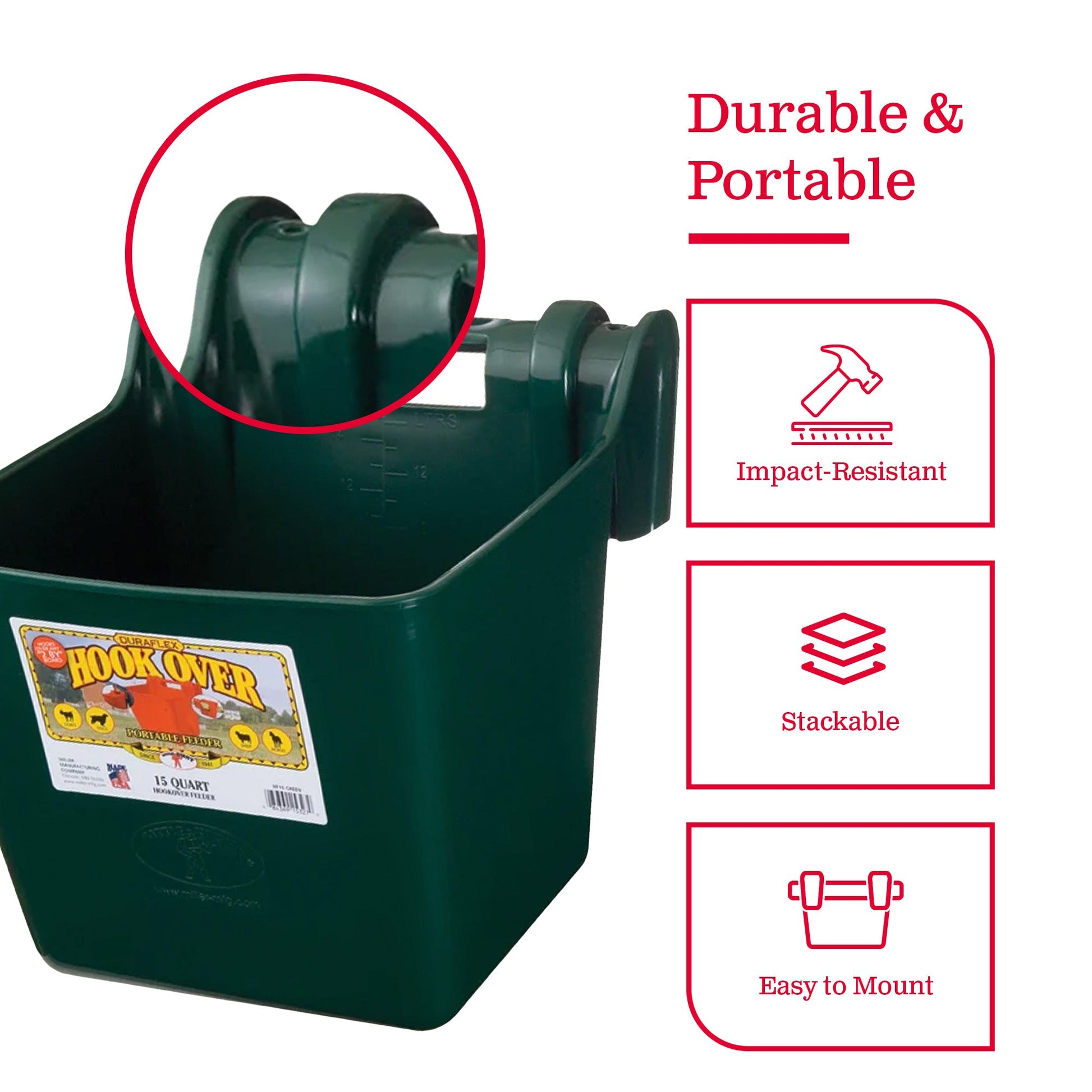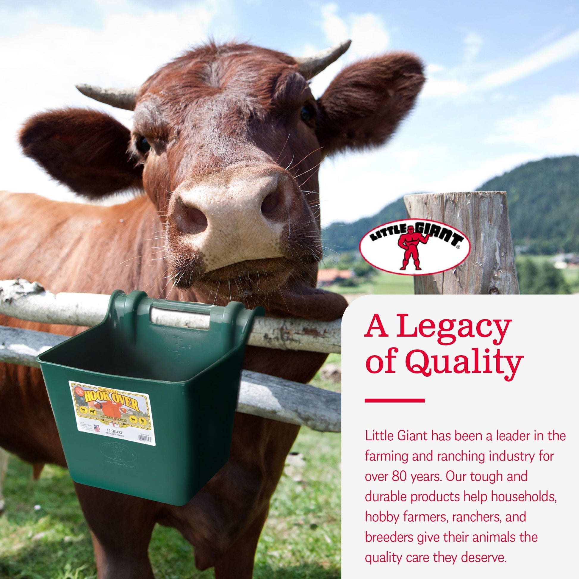 The Little Giant Hook Over Portable Feeder is ideal for field, pasture, trailer, stall, or kennel. Performs well for a variety of animals, including horses, goats, sheep, and dogs. The durable, impact-resistant Little Giant feeder has a molded-in bracket that easily hooks over any 2-by-wide board to instantly deliver a sturdy feed bucket. For more permanent installations, simply install two screws (not included) in the holes provided. Stackable for carrying or storage. The top of the feeder features a convenient carrying handle so you can carry one or more feeders in one hand.