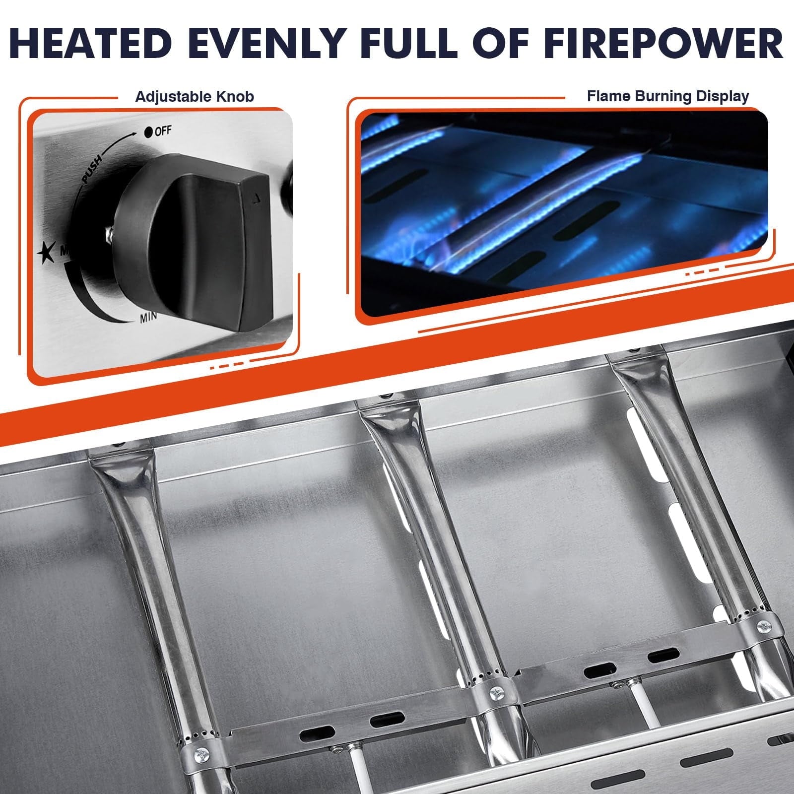 Frizi 30,000 BTU 3-Burner Flat Top Portable Propane Gas Grill with Auto Ignition, Stainless Steel Tabletop Griddle for Camping, BBQ, and Outdoor Cooking