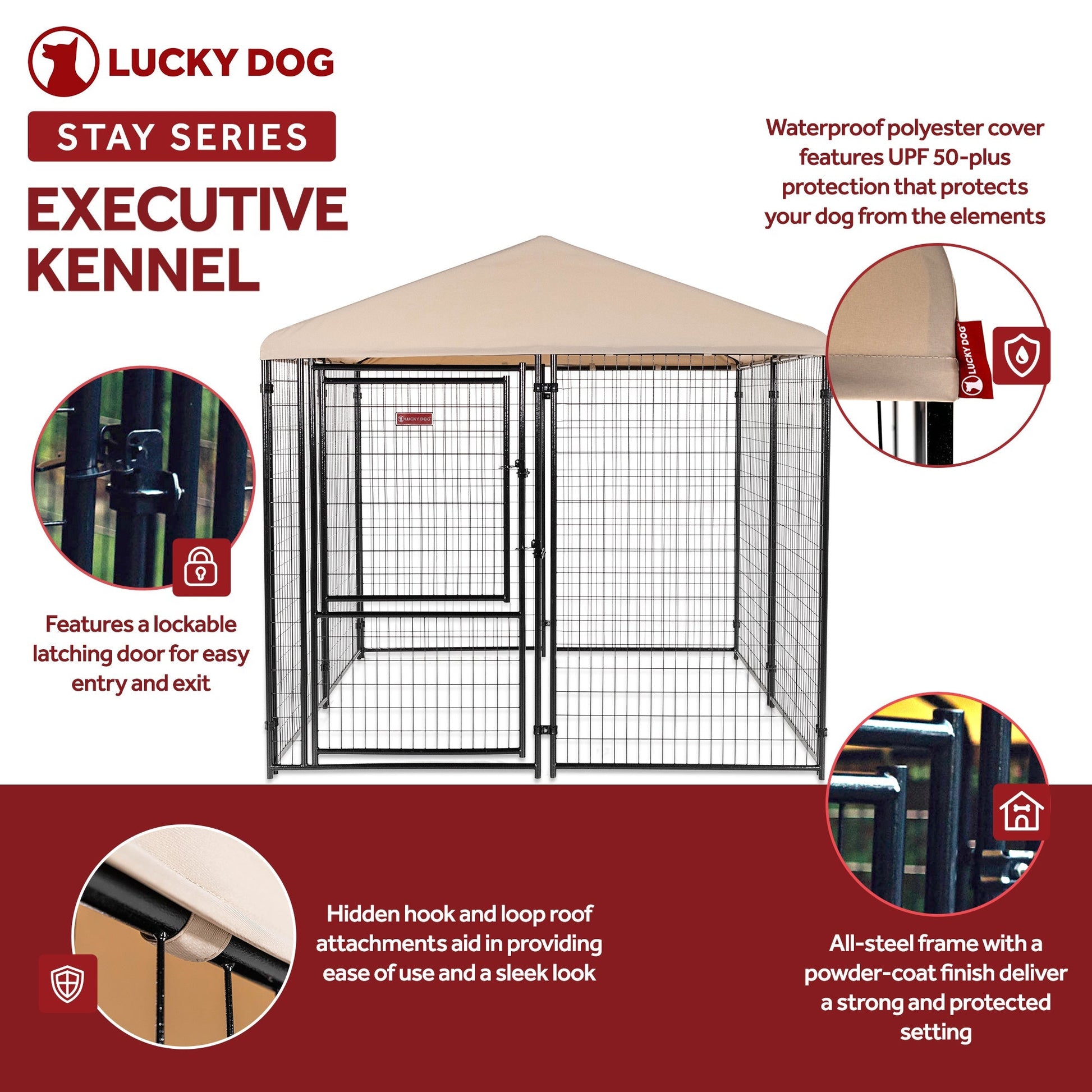 Give your dog the very best. With sleek style and durable design, the Lucky Dog STAY Series Kennel is built with a long-lasting frame and premium roof cover.
