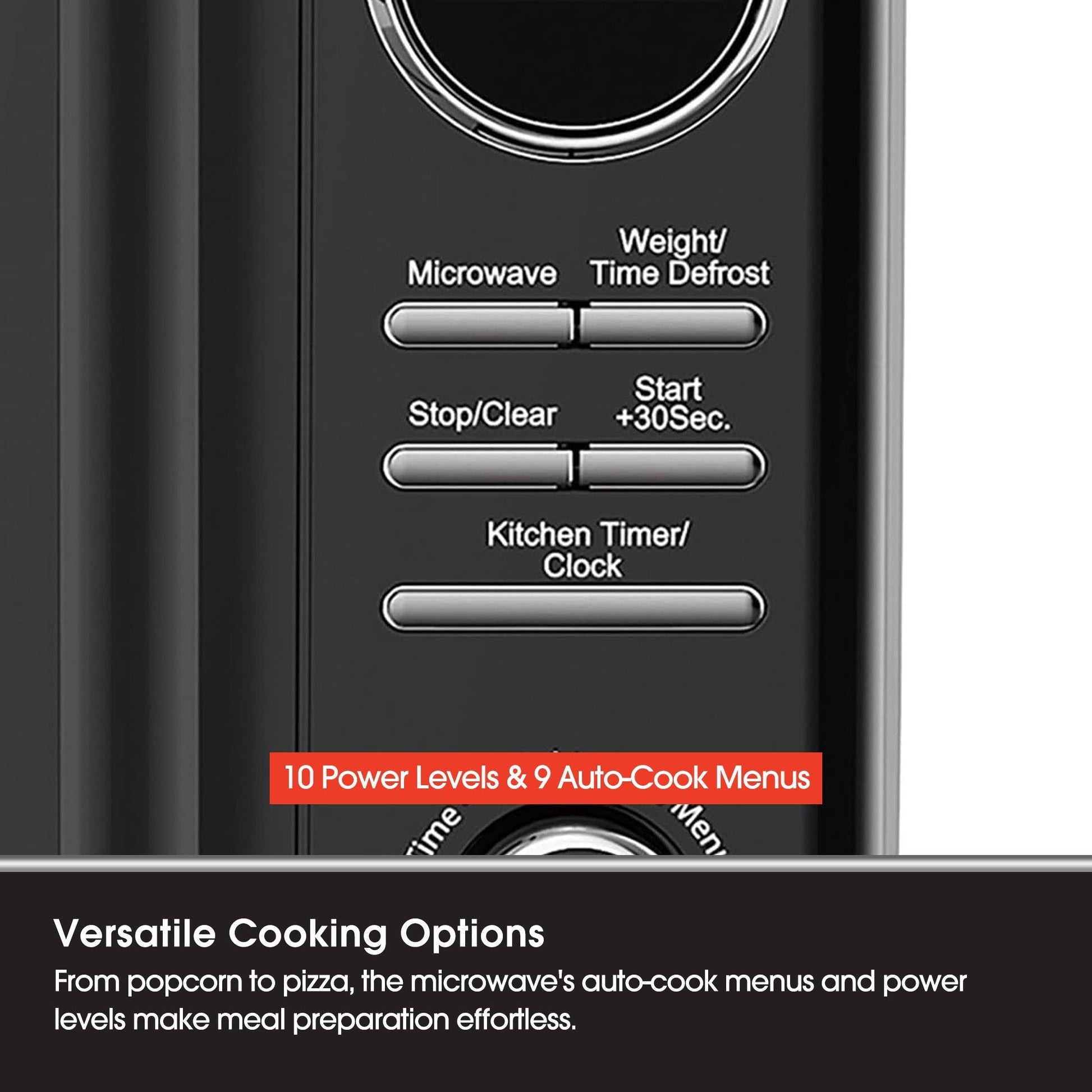 Enhance the ambiance of your kitchen, dorm room, or office with its timeless retro design. The LED display ensures precision in your cooking times, and the user-friendly push buttons and knob control simplify option selection. Dive into a realm of culinary possibilities with 10 power levels and 9 auto-cook menu options, spanning popcorn, beverage, vegetable, meat, pizza, potato, pasta, soup, and reheat. Effortlessly defrost with auto-defrost menus based on both time and weight. The glass turntable ensures uniform cooking, and the multistage cooking feature allows a seamless transition from defrosting to cooking in 2 stages. Achieve both convenience and energy efficiency with the ECO mode, minimizing standby power by turning off the display when inactive. For moments of tranquility, mute the microwave to eliminate beeping, ideal for nap time or uninterrupted calls. Additionally, ensure security with the child safety lock. With a capacity of 0.7 cubic feet and 700 watts of power, this microwave blends power with style. The left swing door opening adds versatility to your kitchen layout. Stay organized with the built-in kitchen timer, keeping tabs on your culinary creations effortlessly.