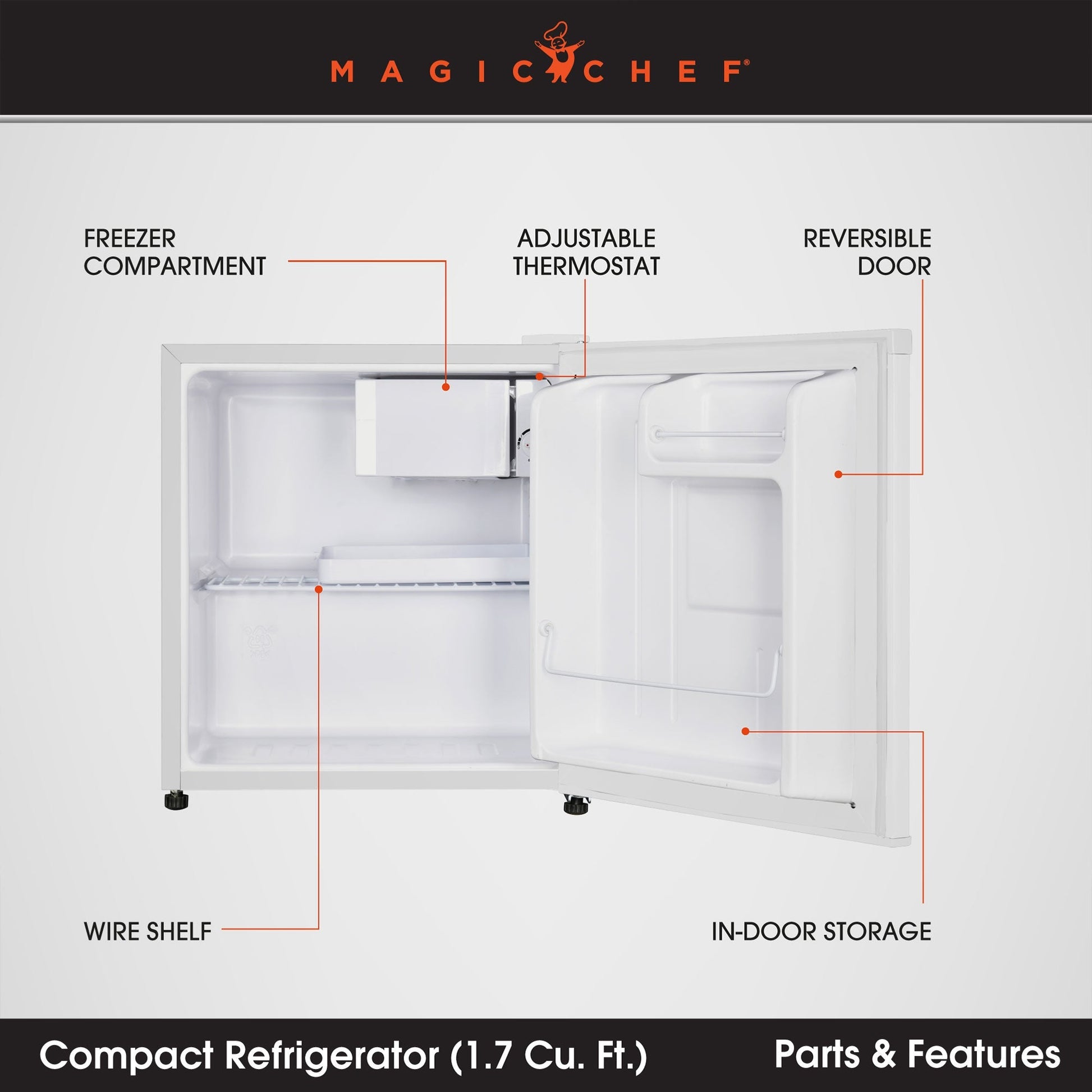 Convenient cold-food storage is always available with Magic Chef! Are you looking for an effective small fridge to add to your home or office space? Maybe you have a college dorm and need a tabletop fridge for snacks, or maybe you just need a convenient office fridge for the break room. Regardless of your situation, the Magic Chef 1.7-cubic-foot compact refrigerator with freezer will work for you. This small fridge has plenty of cool features, including a manual defrost function, a recessed handle that makes the door easy to open and close, and an adjustable thermostat so you can set the fridge to whatever cold temperature your items require. With storage shelves, a reversible door, and convenient in-door storage, it's spacious enough to store what you need so you can always have the right items on hand.