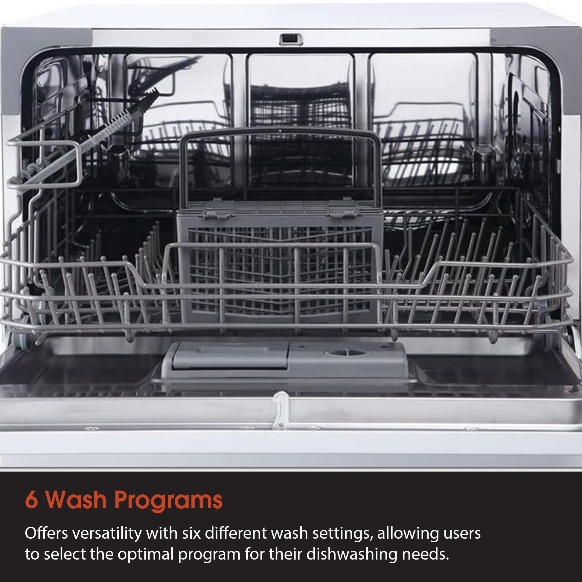 The countertop dishwasher can hold up to 6 place settings, and the interior arrangement includes a cutlery basket and cup shelf. There are 6 wash programs so you can select just the right setting for your dishes. The washer uses a residual drying system, which avoids using air outside the dishwasher to keep your dishes clean and hygenic.