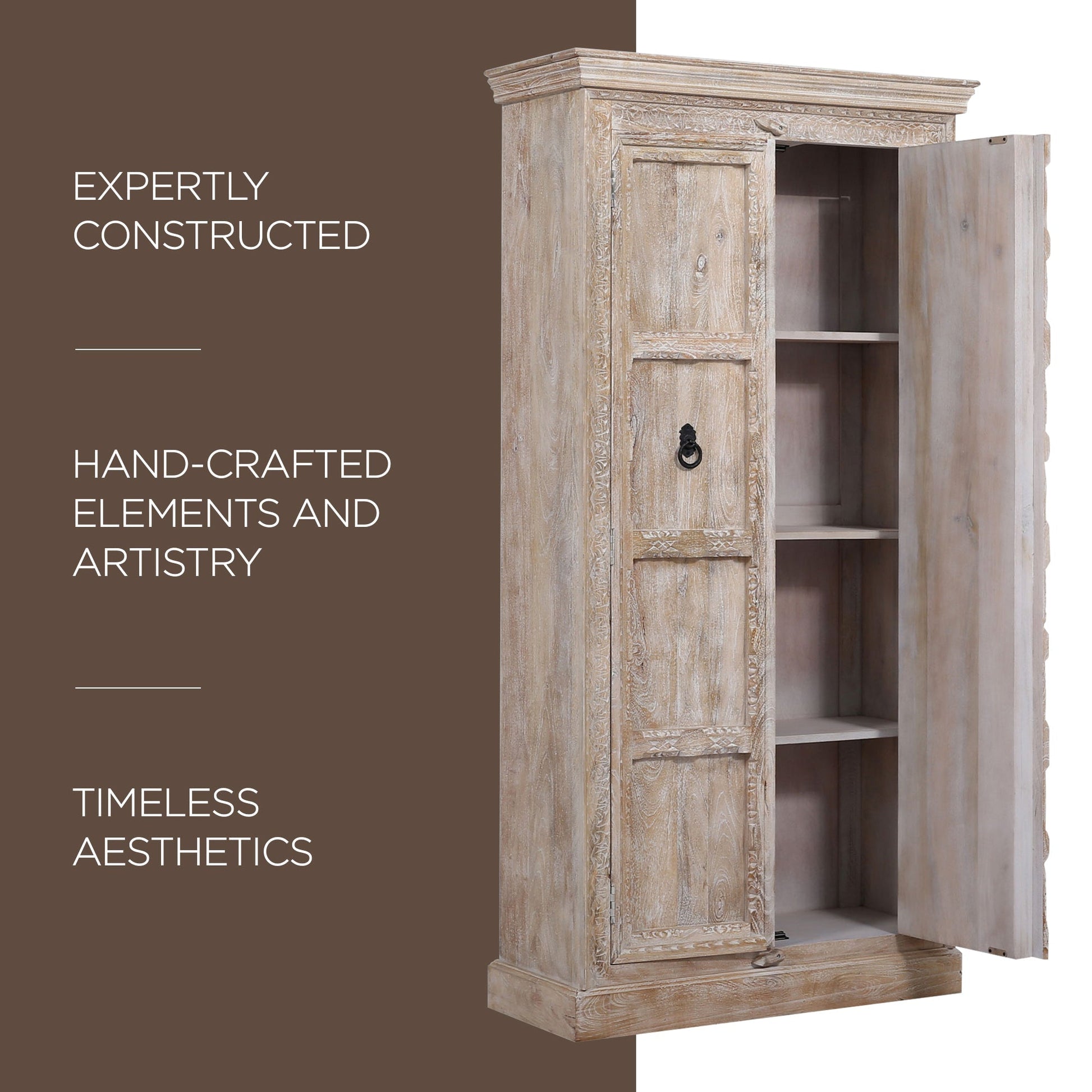 Meander into the vivid world of Indian furniture with our Mahala Wooden Cabinet, where each masterpiece is a testament to the rich cultural heritage that has inspired its creation. Abounding with masterful adaptability, spacious shelves, distressed wood grain, and loads of interior vertical space, this cabinet lets its muted hues and intricate designs captivate your senses as you immerse yourself in a world where art, history, and culture converge. The rectangular double doors offer the utmost in sophistication where art meets function, transforming your abode into a captivating haven that nurtures both body and spirit, reflecting India’s diverse culture and timeless aesthetic sensibilities.