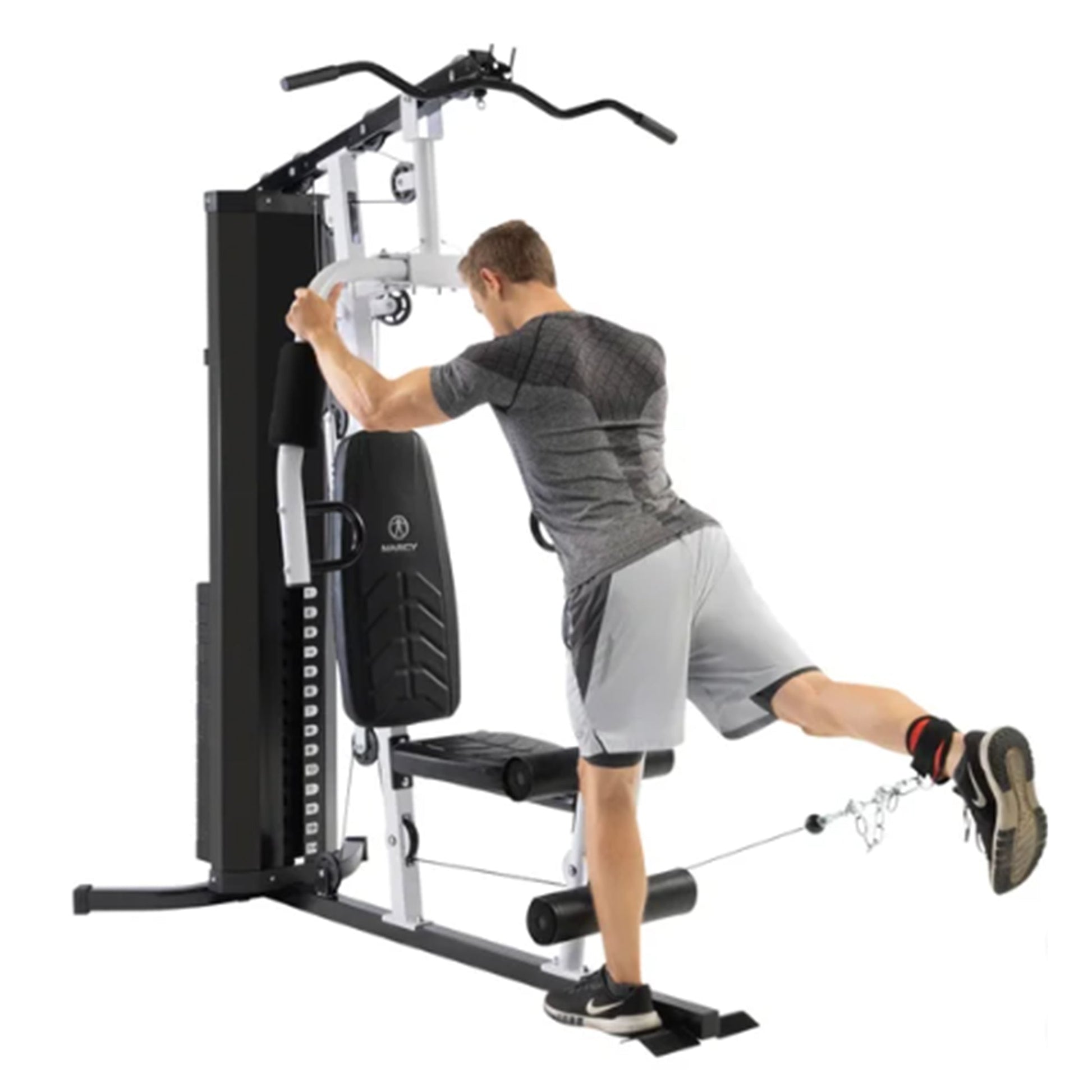 Safety is a priority, as the weight stack design ensures that weights are never suspended over your body, offering safer and more controlled exercises. Whether you're working on your upper body, core, or lower body, this all-in-one gym has you covered. The high and low pulley stations allow for both upper and lower body exercises, while the dual-function press arm supports chest press and pec fly exercises. Additionally, the total leg station developer works your quads and hamstrings, giving you a balanced and effective workout for your legs.