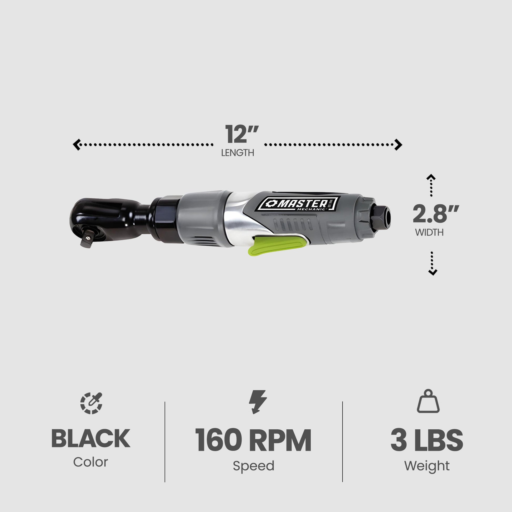Whether you're working in automotive repair, machinery maintenance, or any application requiring precision in cramped areas, this air ratchet is engineered to meet your needs. The combination of durability, power, and ease of use makes the Master Mechanic Air Ratchet a must-have tool for professionals and DIY enthusiasts alike. Get the performance you need with a tool designed to last, featuring superior construction and cutting-edge features tailored for optimal performance in any challenging environment.