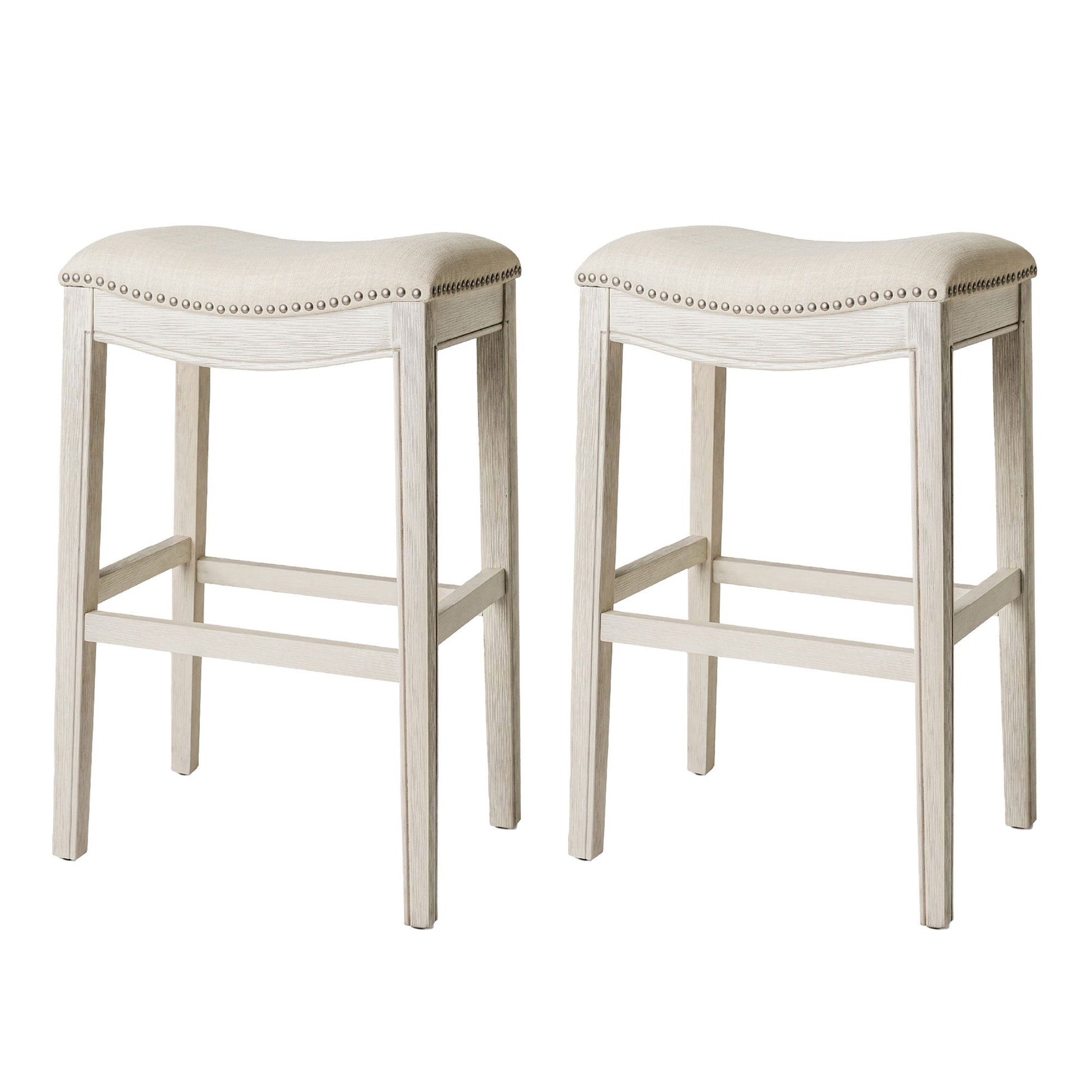 Maven Lane Adrien Saddle Bar Stool in White Oak Finish w/ Natural Fabric Upholstery, Set of 2