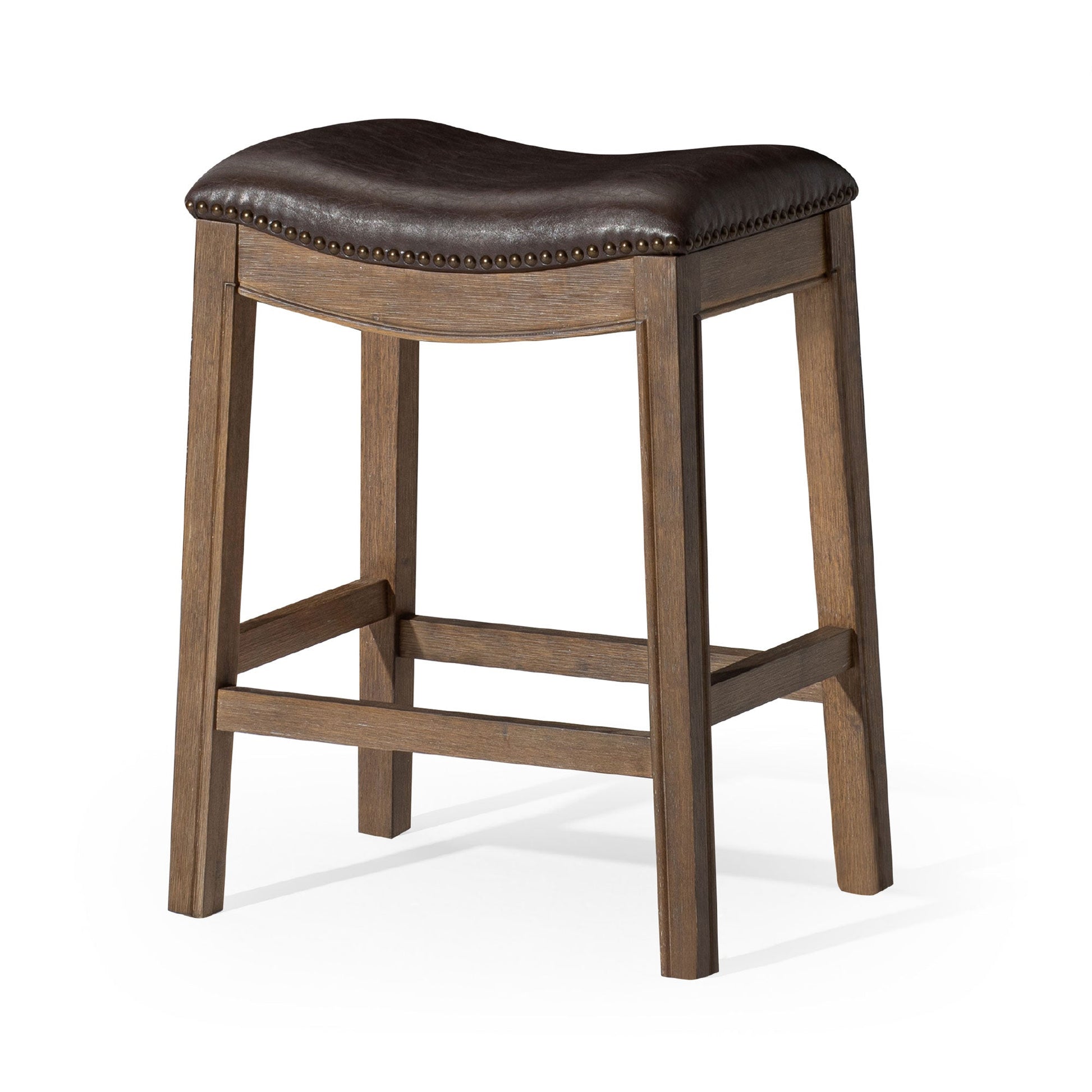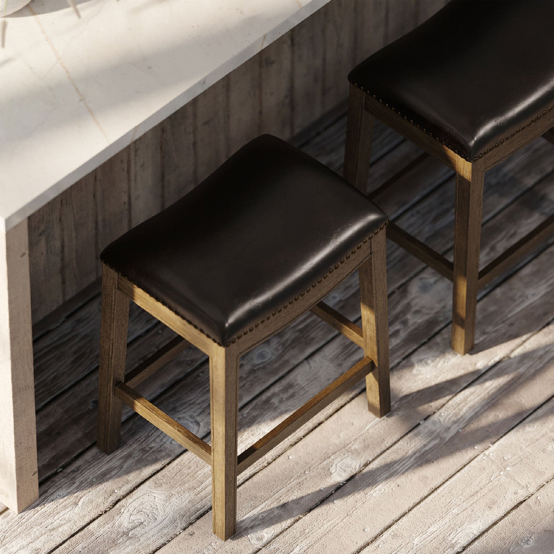 - A timeless masterpiece crafted with vegan leather, our Adrien backless saddle stool blends sophistication and coziness with premium PU leather upholstery, nailhead trim, and multiple wood-finish options