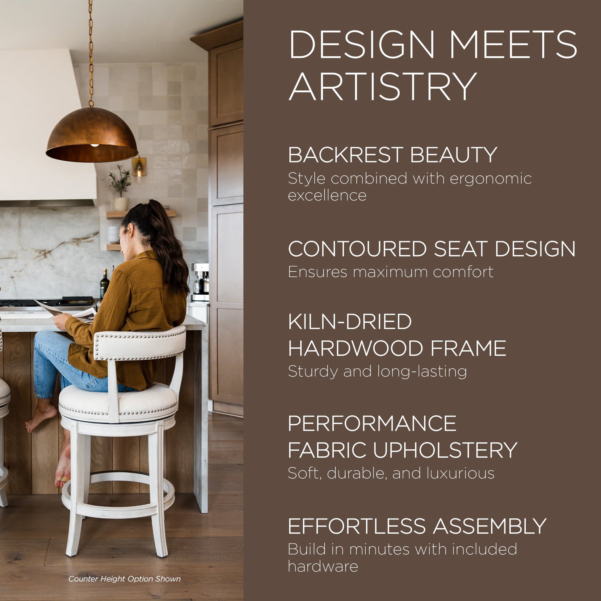 The epitome of stylish sophistication, our wooden Alexander Stool is essential. With each hand-crafted detail, like a fine wine, this high-quality kitchen barstool with back keeps getting better. A kiln-dried, solid wood frame and premium fabric upholstery synchronously collide to exceed your expectations while bestowing beauty upon your home dining space. The hand-applied nailhead trim and hand-carved woodwork undoubtedly display why elegance is in every single detail. The smooth, rotating swivel seat allows our wooden bar stools to remain stationary as you pivot, while the 180-degree memory return swivel will take you right back to your counter for your daybreak cappuccino upon request. The comfy yet sturdy upholstered seat and low-profile backrest comfortably support your entire crew for all celebrations, big and small. Flawlessly at home, tucked beneath your breakfast bar, kitchen booth, or countertop island, our swivel barstools are precisely what your space desires and offer impeccable attention to detail you’ll admire. We offer counter height and bar height stool options, so you can select the stool to fit your vision flawlessly. Please measure your space before ordering, as we recommend approximately 10" between the bottom of the counter surface and the top of the stool cushion when fully assembled for ideal comfort. At Maven Lane, our wood stools are meticulously handcrafted with methods to stand the test of time, including hand finishes displaying impeccable attention to detail and mortise-and-tenon joinery, which promotes strength and longevity. Furthermore, by utilizing premium upholstery and kiln-dried hardwood in our solid wood furniture, we’ve solidified the superiority of craftsmanship. We've carefully curated an entire medley of heirloom-quality pieces that can be mixed and matched to create the aesthetic your home has been seeking. Given the handmade nature of our products, minimal variations may occur in color, tone, and wood finish.